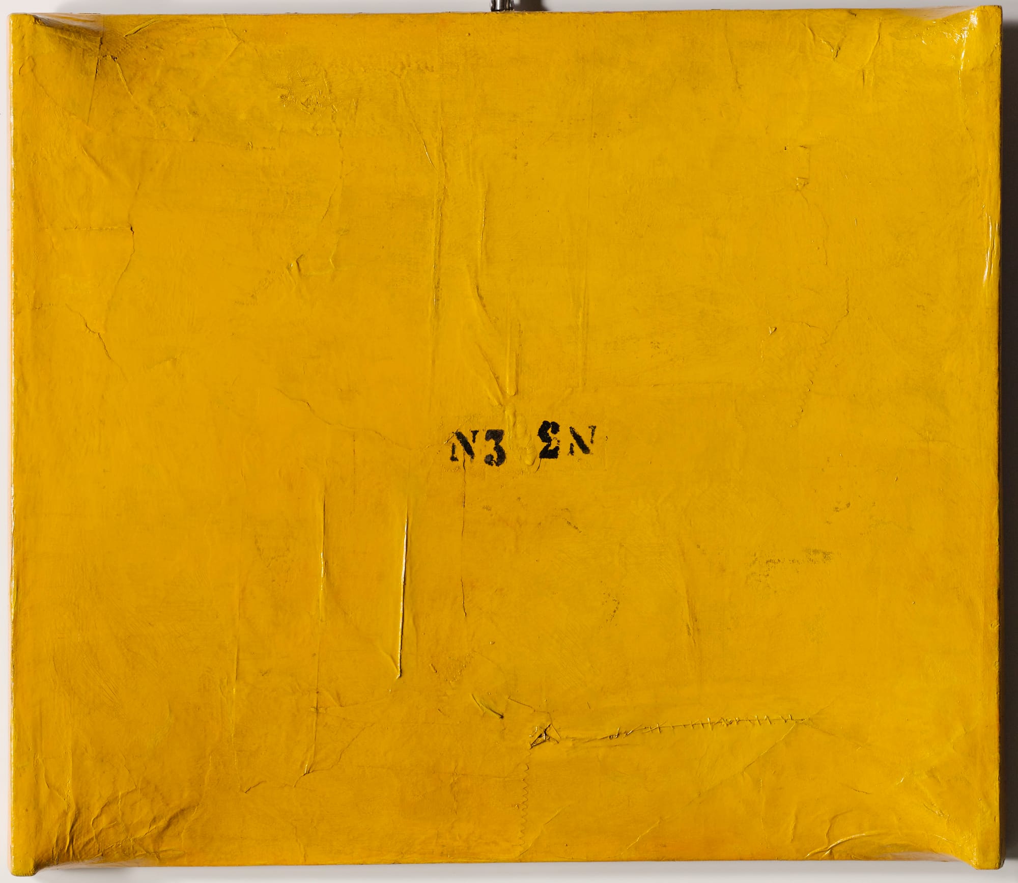 In “N. 3” (1960), Schifano coats sheets of paper in a glossy yellow enamel, which he collages to a three-dimensional stretcher, whose four corners extend beyond the painting’s perimeter, evoking a stiff pillow. The title is stenciled twice in black in the middle of the yellow field, with the left one correctly aligned and the right one upside down and backwards. This means the painting can be turned around, that it has no proper top or bottom.