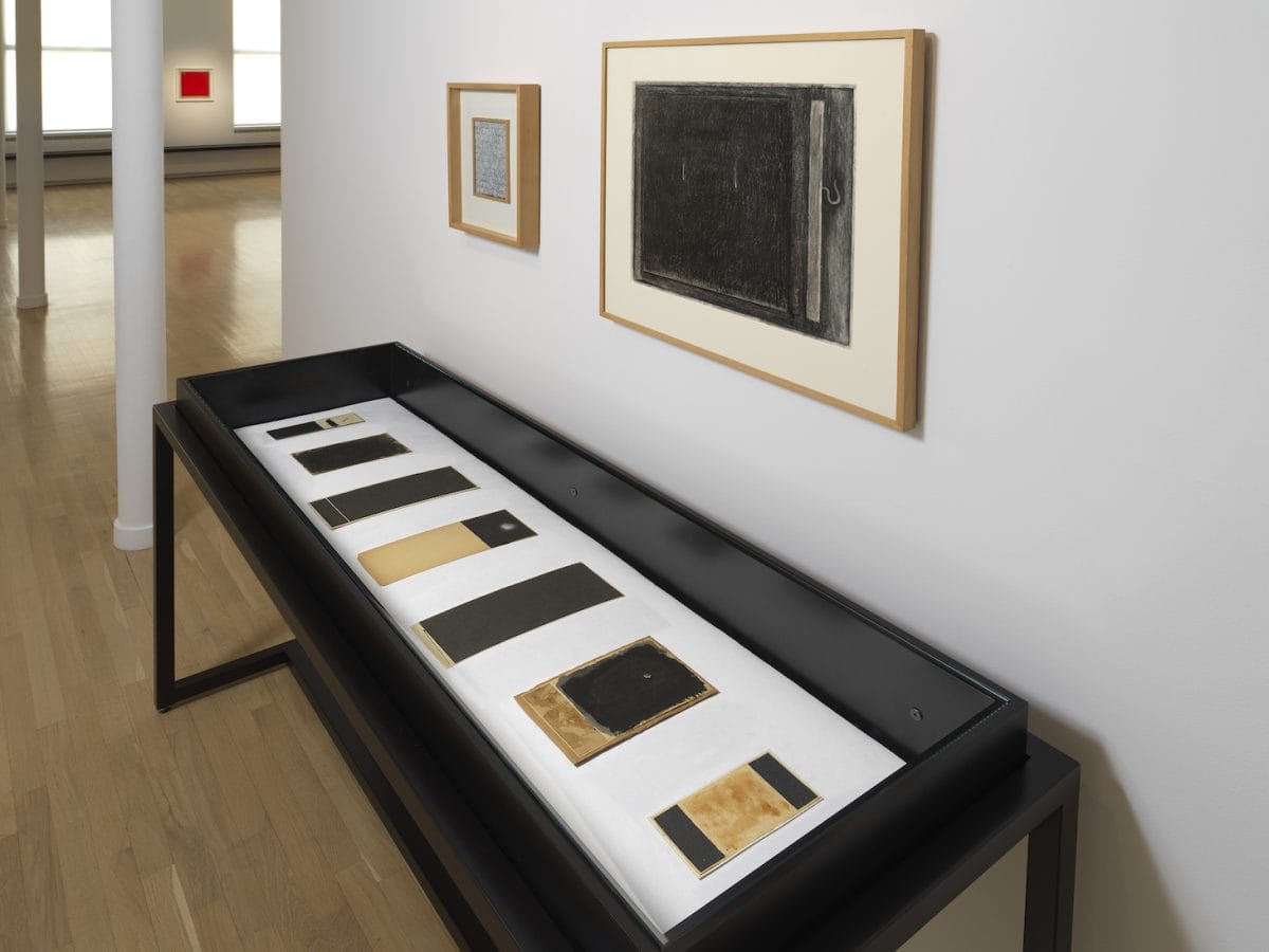 A vitrine of seven untitled works done in gouache, ink, and paper collage on cardboard (all c. 1952) by Robert Rauschenberg sent my mind spinning.