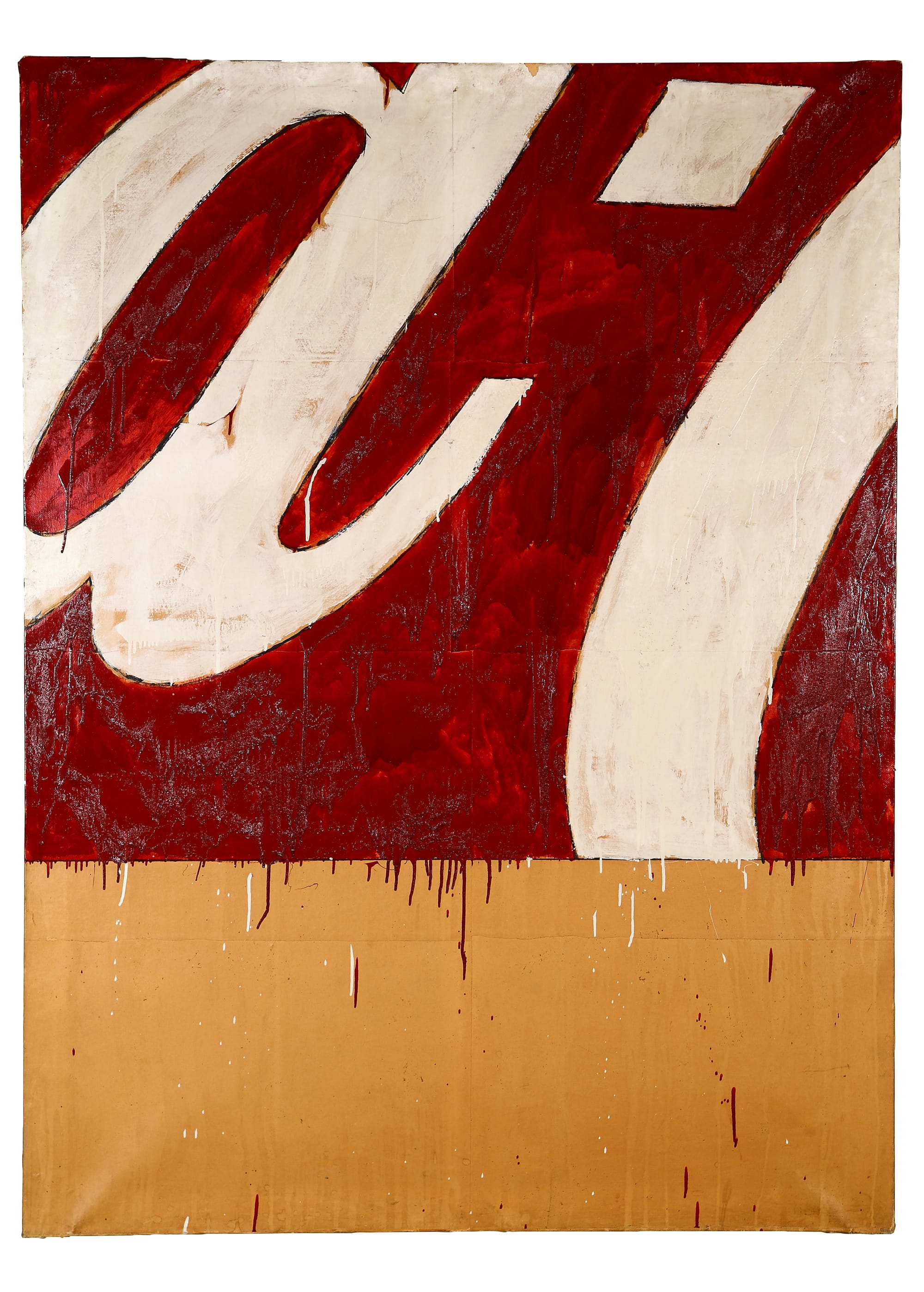 Warhol seems to be celebrating capitalism’s concealment of class division when, in The Philosophy of Andy Warhol: From A to B and Back Again (1975), he wrote: “You can be watching TV and see Coca-Cola, and you know that the President drinks Coke, Liz Taylor drinks Coke, and just think, you can drink Coke, too.” By rendering part of the Coca Cola logo and calling it “great propaganda,” Schifano is proposing the opposite, that it is another part of a publicity machine spreading falsities.