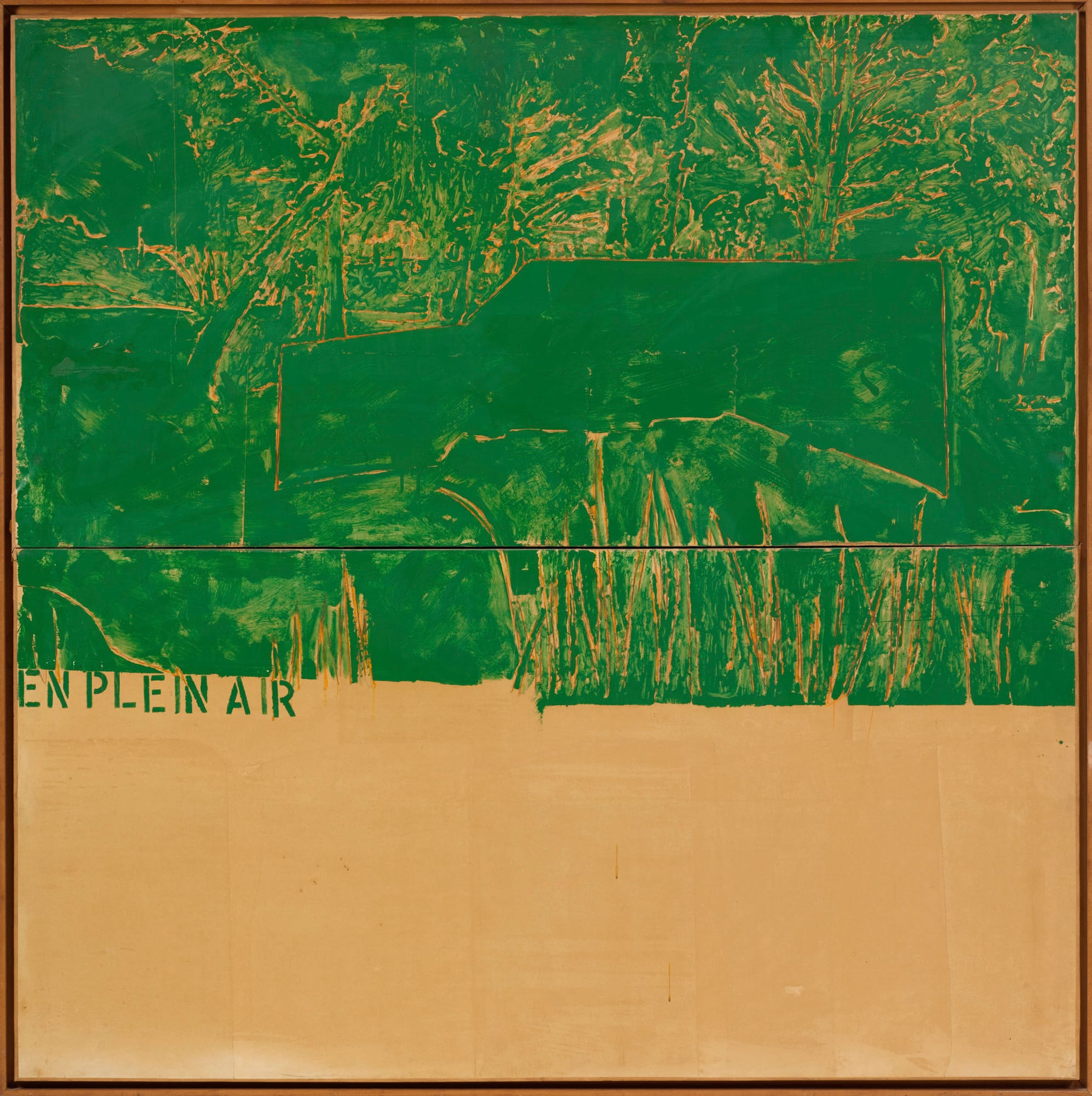 The image in “En plein air” is derived from an Italian advertisement for the German-made Volkswagen, which had been adapted for families. The green image occupies the upper two thirds of the rectangle, with the title, “En plein air” stenciled just beneath it, on the left side. Schifano most likely used a slide projector to transcribe the image onto the sheets of paper. The car and family have been removed and replaced by a geometric shape that vaguely resembles a car.