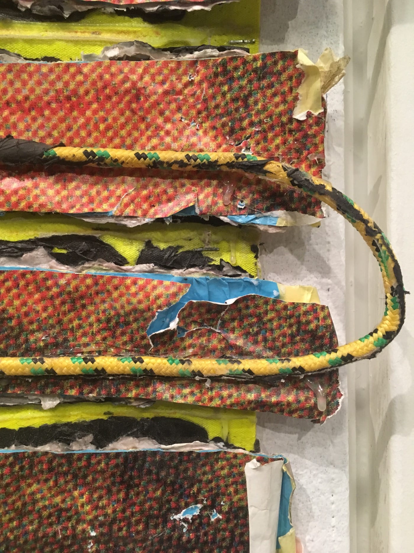 Within Bradford’s “Pickett’s Charge,” there is a rawness, a free construction that flies in the face of popular culture’s insistence on a simplified historical and visual record. Throughout it all, he rips through the history of southern defeat, tearing up Philipoteaux’s “Pickett’s Charge,” emmeshing the reproductions within complementary layers of white, bright blue, and deep black tissue, and then finishes by literally tilling the terrain of this work’s surface with the ropes that binds it all together. This technique leaves a sort of fluid path into the past in its wake, which we most clearly see in his panel “Man with the Flag.” The final result looks like a delicately colored, mille-feuille façade, mixed in with jagged papier mâché sculpting to give it dimension and form. The alternating rough and smooth selection and treatment of his materials serve as a symbolic parallel to his subject matter — uncertain beauty, along with undeniable entropy, lies in the present and future.