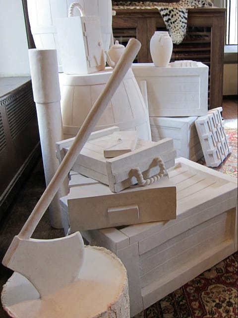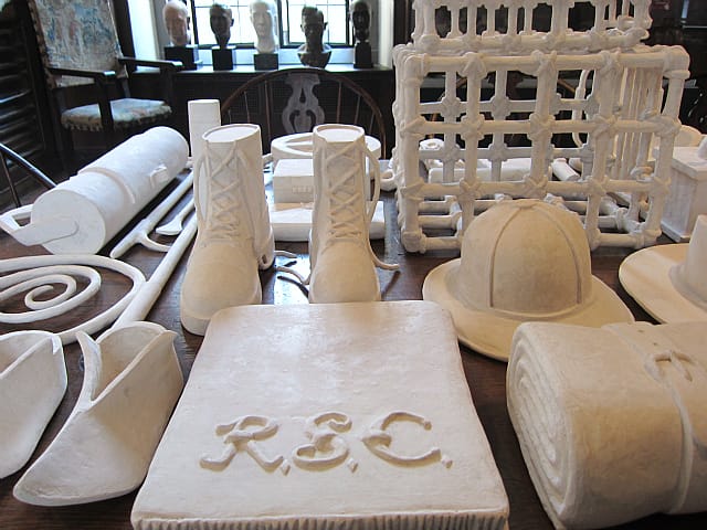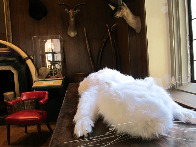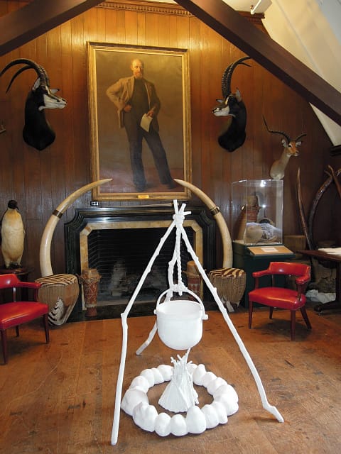 Unlike a museum exhibit that would recount the facts of an expedition, Dion is responding to the spirit of it through a display of white papier-mâché objects that are meant to be the phantoms of objects, or, in Dion’s words, “the sun-bleached bones of expeditions past.” The main part of the installation is on the Trophy Room’s long wooden table, which is crowded with everything necessary, and some things unnecessary, to an expedition, including cameras, guns, scientific instruments, boots, hats, containers and cages for specimens, food and water, as well as luxury items like a teapot and coffee grinder. Sterling Clark and other wealthy white explorers of the early 20th century were not setting off into parts unknown without a bit of the comfort they enjoyed at home, even if they might end up suffering stranded on some block of ice or sweltering in a distant desert.