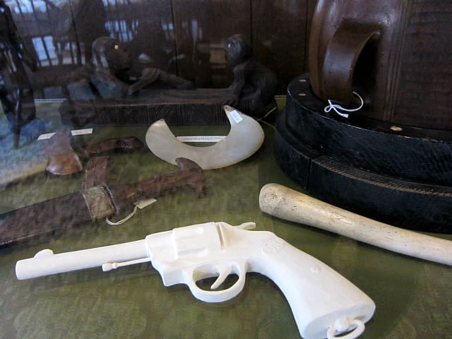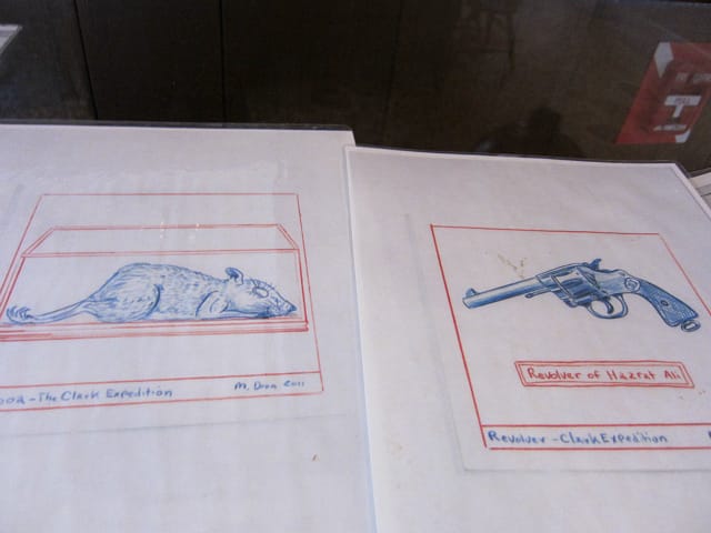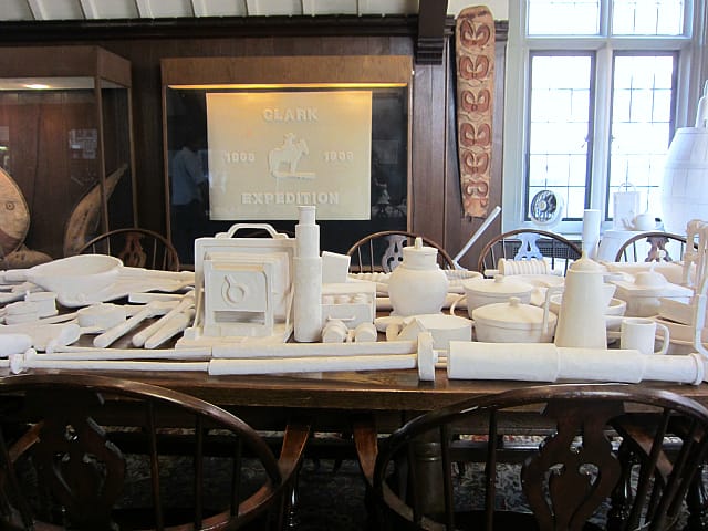 While most of Dion’s sculptures are displayed on the main table, others are incorporated more discreetly into the Trophy Room’s permanent exhibits. A recreation of the gun left fatally behind at the Clark Expedition camp by Hazrat Ali, a surveyor with the party who was killed after an entanglment with local bandits, is in a case with real guns and weapons from other expeditions, a reminder of the serious nature of trekking into a foreign wilderness.