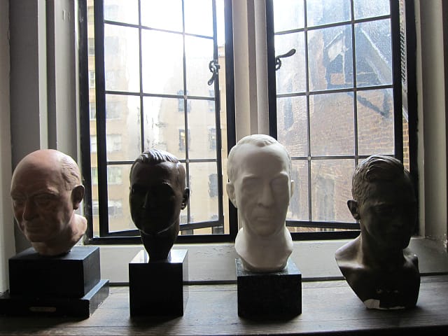 A marble bust of Sterling Clark brought down from the Clark Institute also rests among those of explorers on a windowsill. These white objects are not dissimilar from the taxidermy predators that stalk around the Explorers Club, such as a polar bear on the second floor posed in a ferocious facsimile of its life, or the rickety wooden sledge lashed with sinew from the Robert Peary expedition to the North Pole hanging in another room that can only hint at the brutal trials of that expedition. They, like Dion’s installation, are phantoms of history,