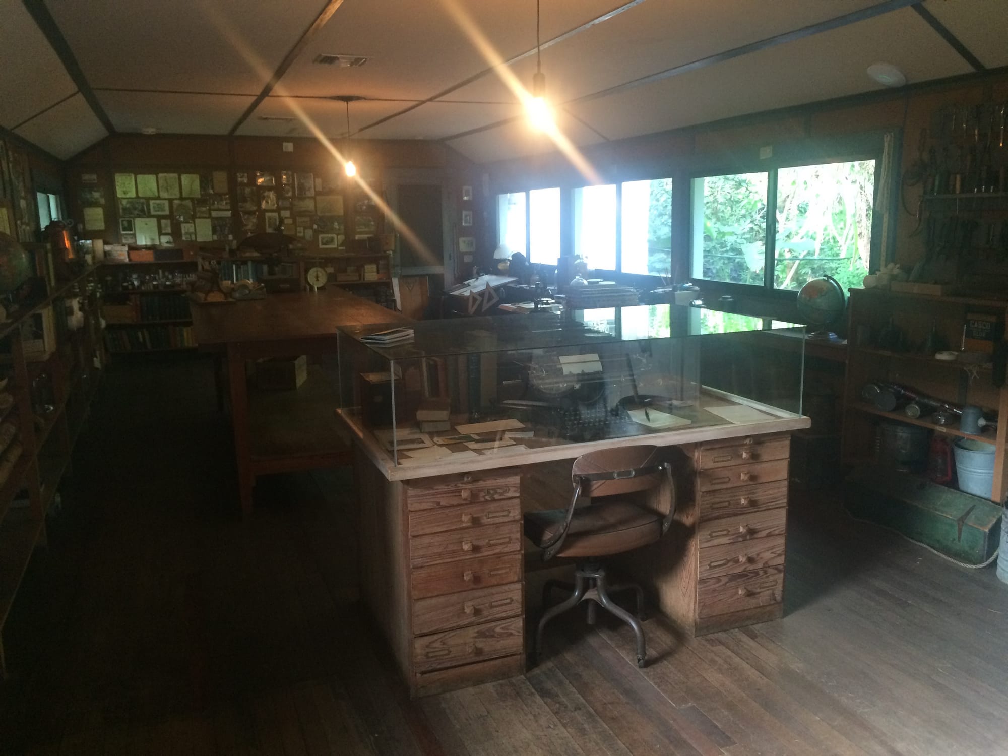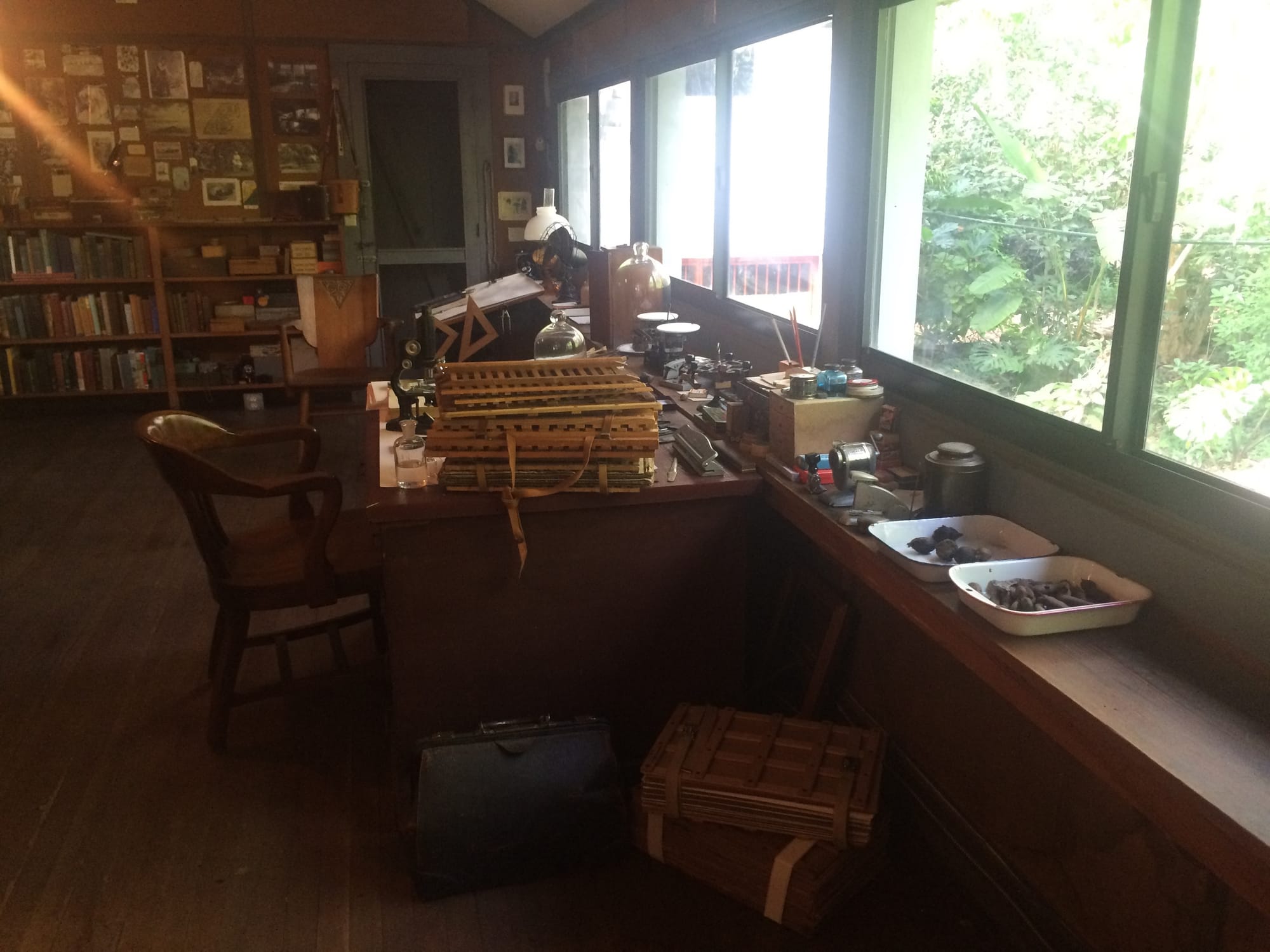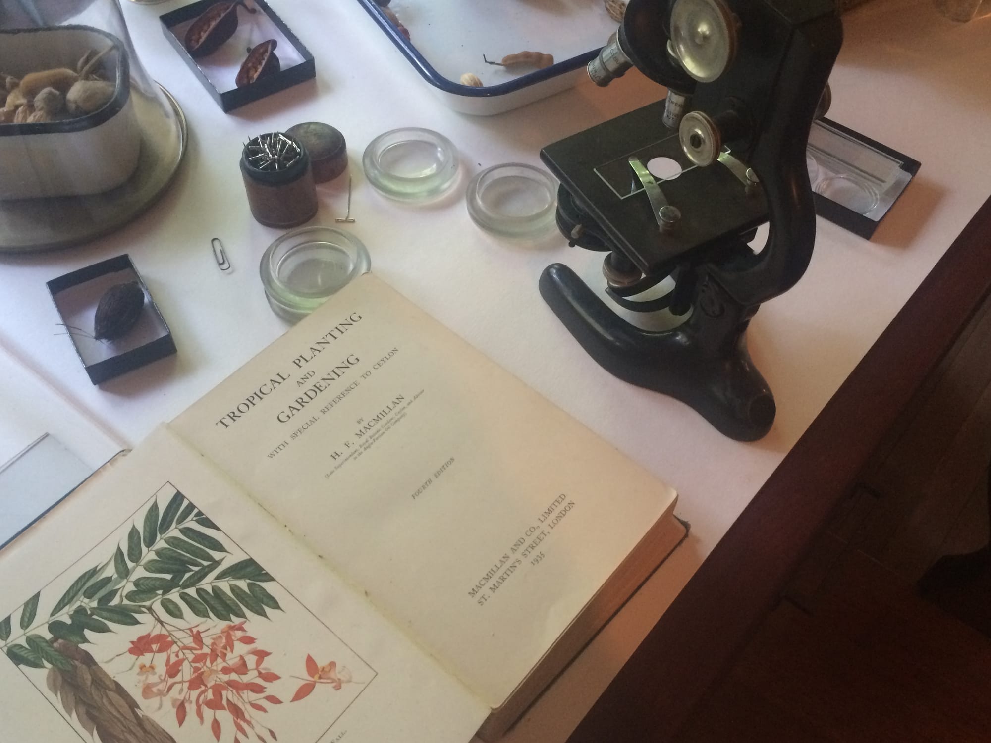 A sense of whimsy permeated his studies. In his 1939 book, The World Was My Garden, Fairchild wrote, “a small microscope will reveal wonders a thousand times more thrilling than anything which Alice saw behind the looking-glass.” It’s in the spirit of this exploratory wonder that artist Mark Dion has created a reimagined version of Fairchild’s lab (titled “David Fairchild’s Laboratory at the Kampong“) at the botanist’s former home, the Kampong, in Coconut Grove.