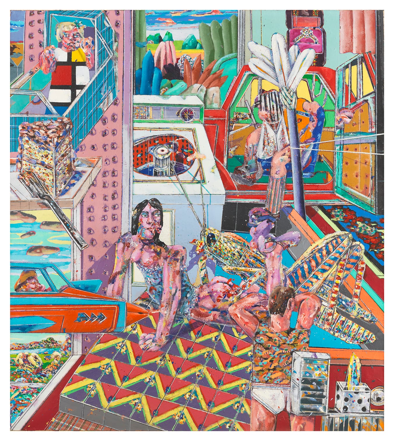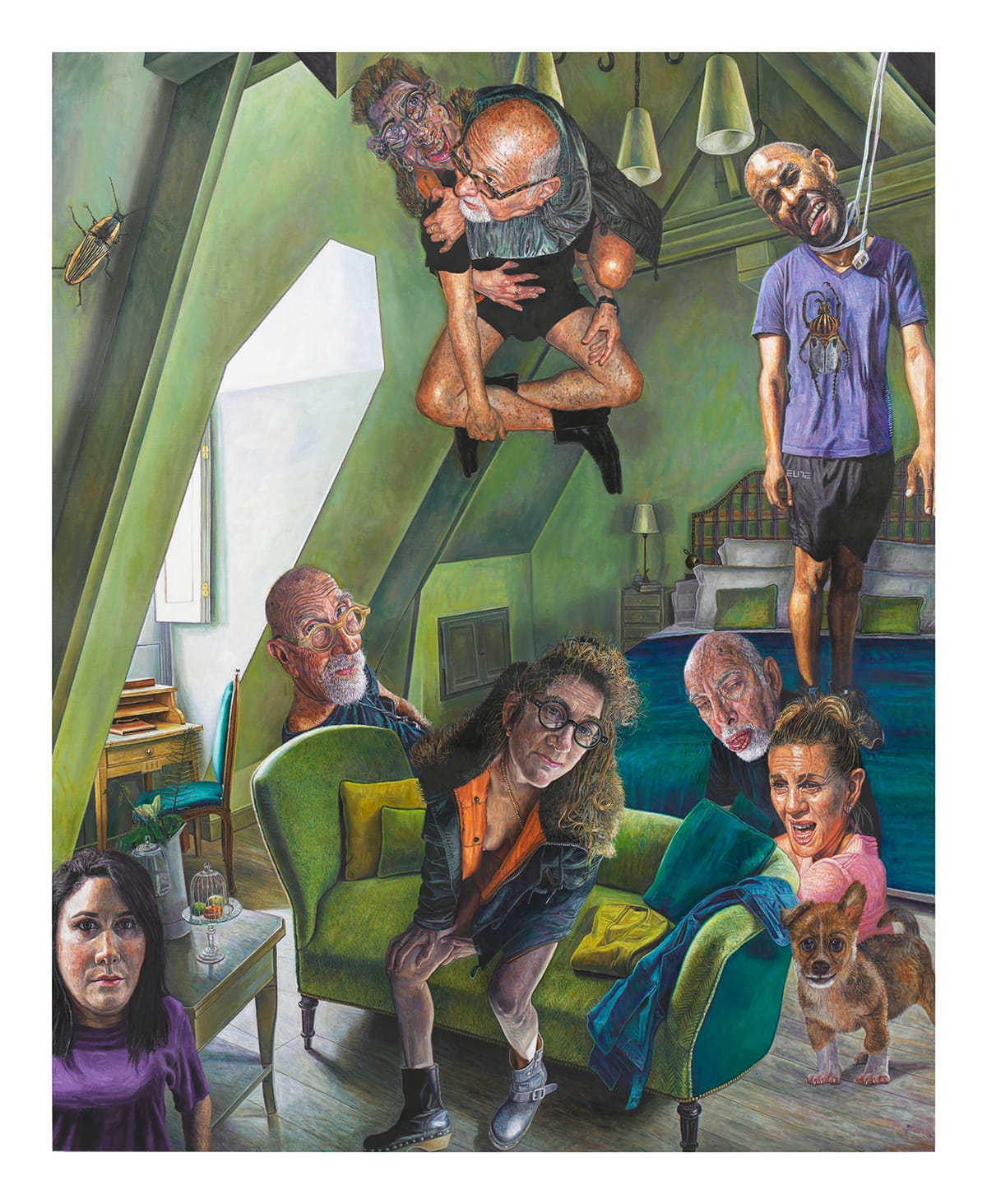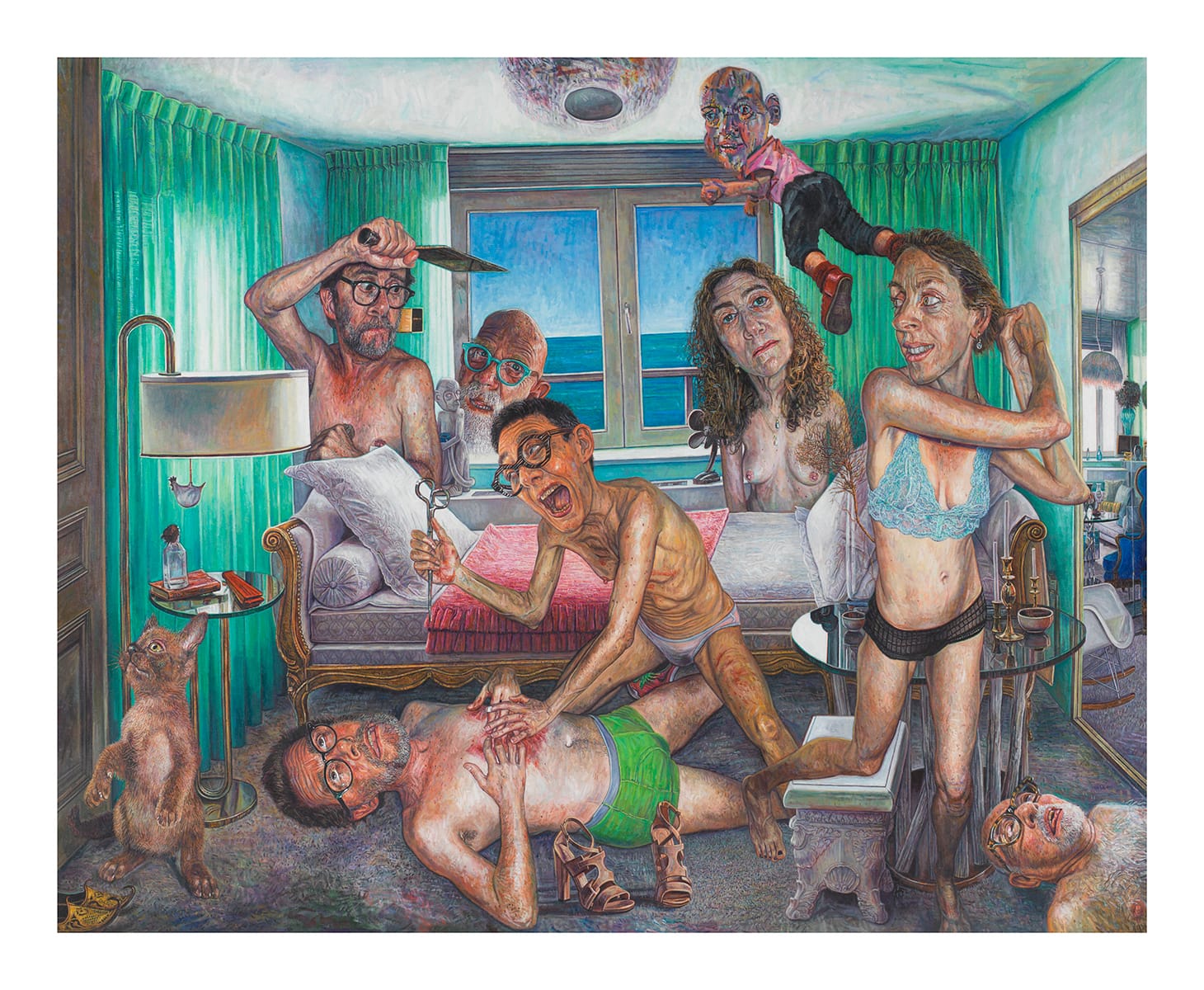 And yet, for all the violence — implied and otherwise — some of the figures seem to be mugging for the camera, while others are lost in a hypnotic daze or busy with their hair. What is the oversize cat standing on its hind legs near the painting’s lower left corner looking at? Who is the bearded, bare-chested man collapsed in the opposite corner? Is that Chuck Close, in green-framed glasses, appearing as a bodiless head hovering on the windowsill? And what about the naked man next to him, wielding a meat cleaver? Floating above them all is the only fully clothed figure in the picture, with the body of a boy and the face of a man, whose face is red and blue and demonic.