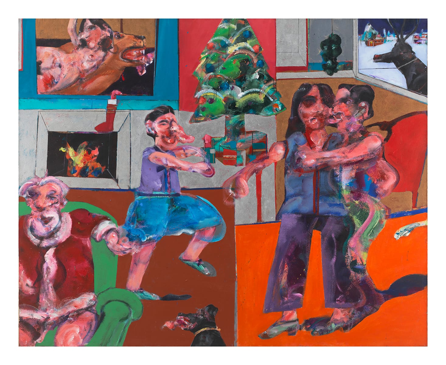The room itself is an interlocking series of monochromatic rectangles, which section the space off, adding to the feeling of isolation that runs through the composition. The boy, who looks like he is striking a kung fu pose, occupies a maroon square facing the man and woman, who are standing in an adjacent, red rectangle. The woman faces us, while the man is either embracing or restraining her from behind. Santa Claus seems to be partially undressed, with what could be his penis peeking out from under his red and white suit.