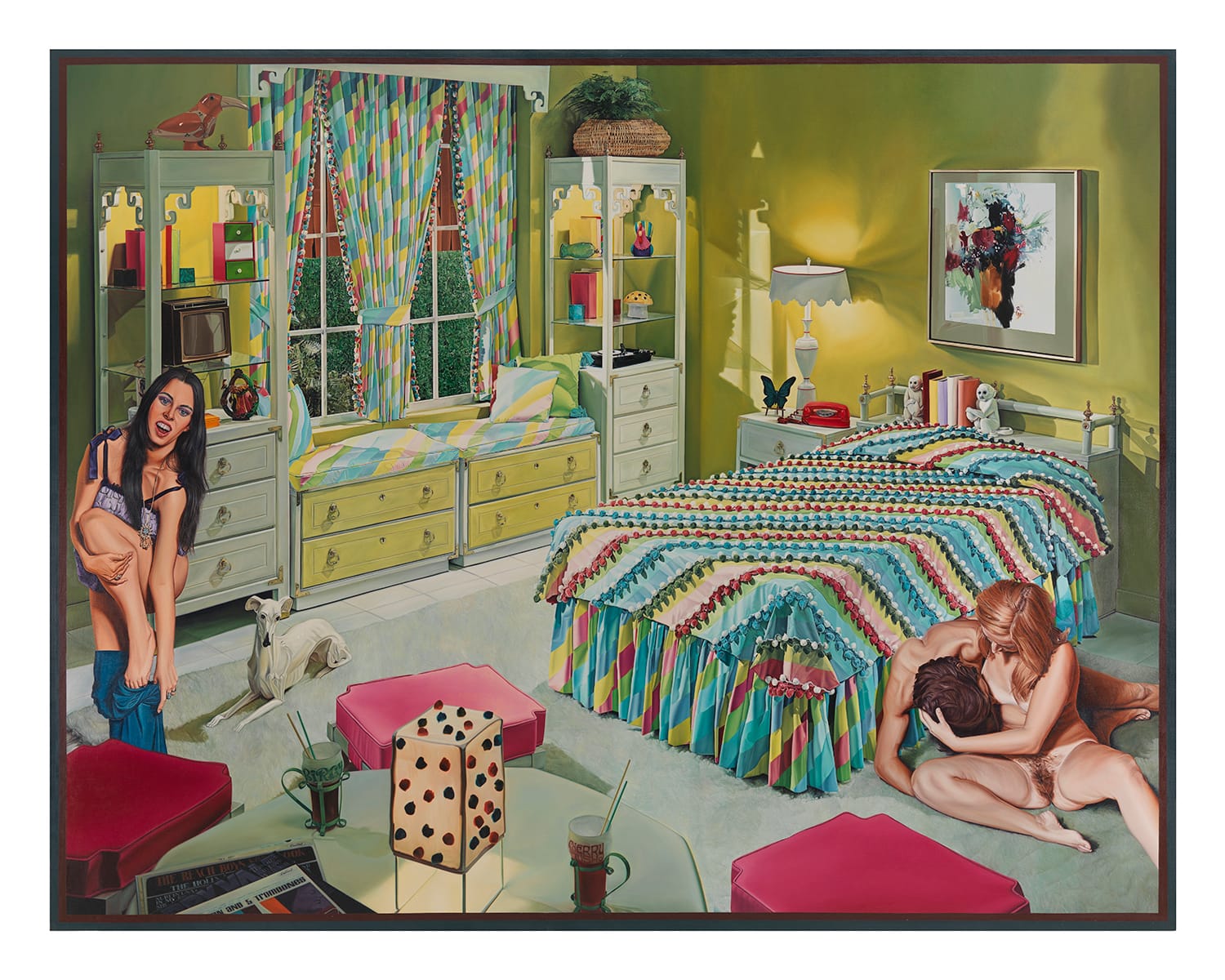 In an early work, “Christmas Painting” (1964), whose figures, in contrast to his later, hyper-realist style, share something with Bacon’s expressionist distortions, Greenwold presents us with all the trappings we associate with that holiday: a Christmas tree, Santa Claus, a stocking hanging above the fireplace, a reindeer peering through the window, a dog, and a nuclear family – man, woman, a boy. The painting above the fireplace depicts a woman lying nude on an animal rug, most likely a bear.
