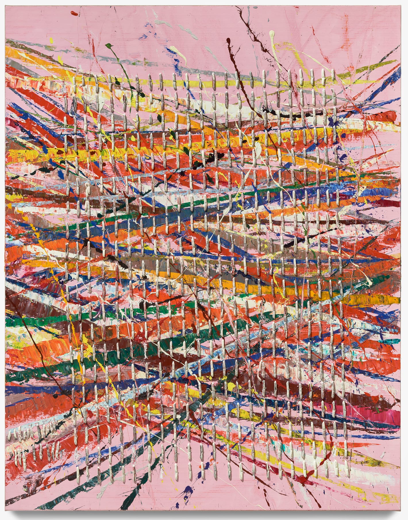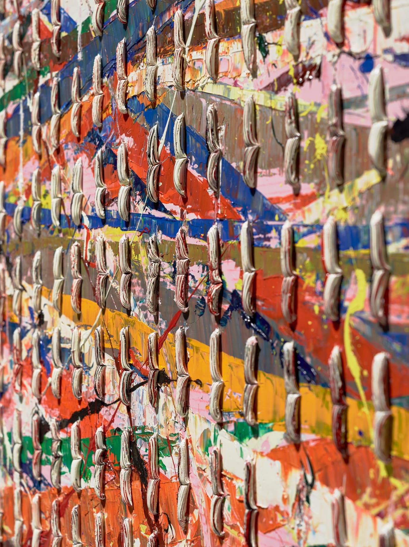 One thing I have to say about these works is that they are busy. They invite you to stand close and see the different strokes made with a palette knife. You might wonder how he got the striations of another color in his blurts of paint that look like they were squeezed from a tube. You might puzzle over how these perfect worm-like sections of cinched paint sit on the painting’s uneven surface, showing no evidence of gravity’s tug. You might be impressed at how evenly spaced these cinched worms are and that they form a grid extending slightly off the surface.