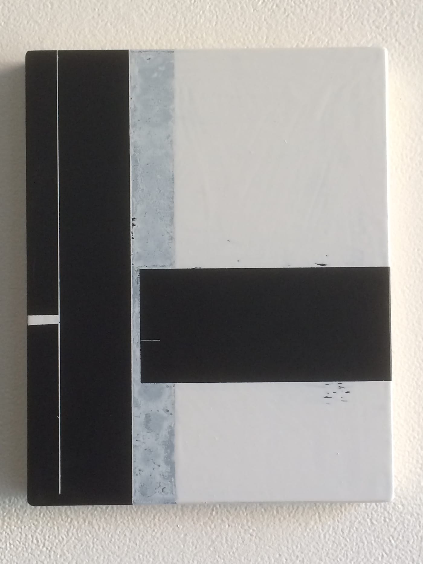 As I turned away from the darkness of “b/w/g#14,” the starkness of “b/w/g #15” (2016) pleasantly surprised me. Bright white dominates the surface in this work. The contrast of the black strip down the left side, as well as the thin, horizontal, and imperfect black line near the middle heighten the austerity of this particular work. By the time I experienced the juxtaposition of “b/w/g #14” and “b/w/g #15” I felt as if the show had centered my thoughts.