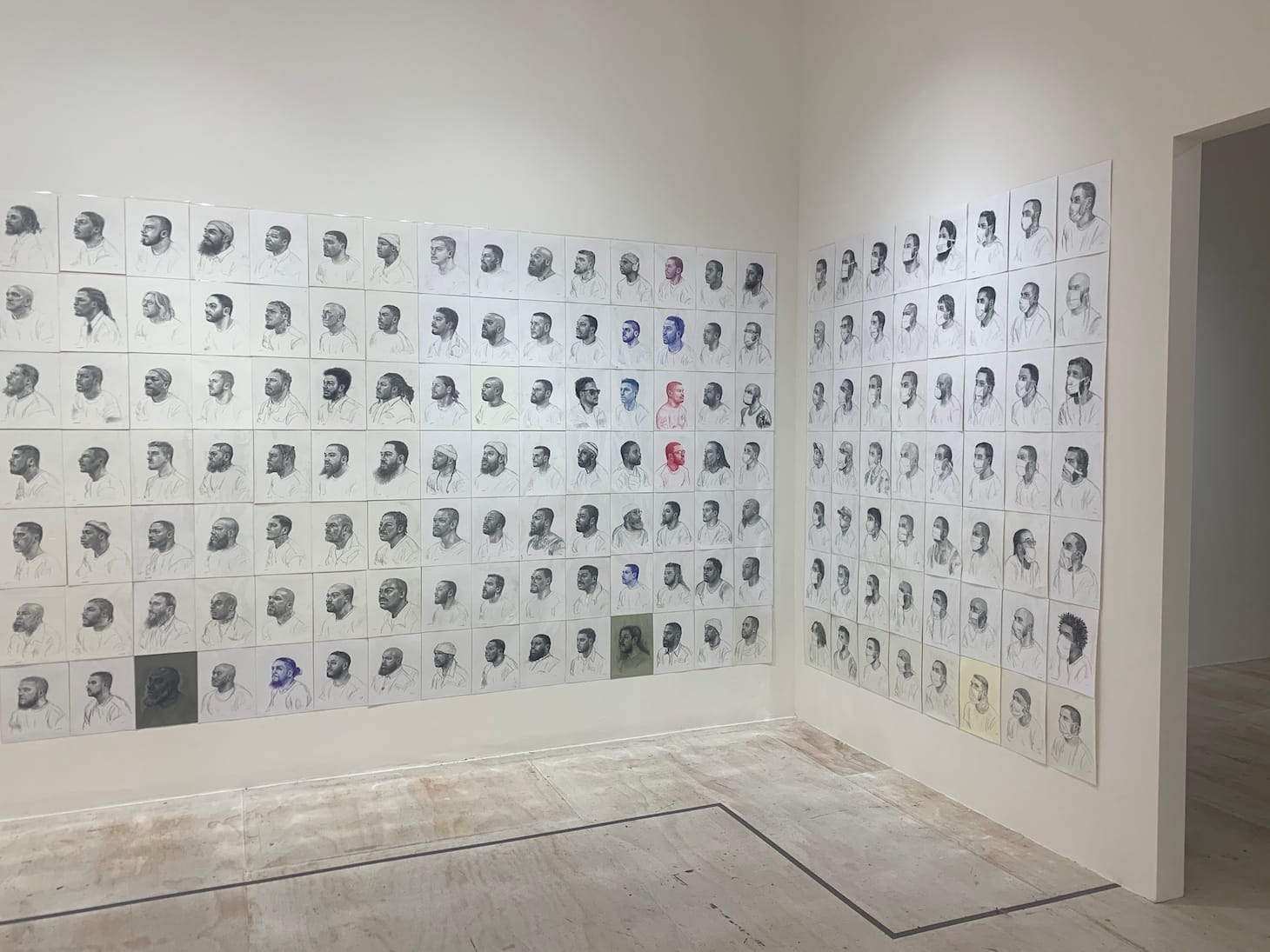On the afternoon of my visit, I paused to study nearly every piece of art. I found myself rapt in the complex galaxy of artists spanning the galleries. Immediately after viewing the show in its entirety, I returned to its first gallery, featuring “Pyrrhic Defeat: A Visual Study of Mass Incarceration” (ongoing) by Mark Loughney. The portraits, rendered in soft pencil sketches, enclosed the space in profiles of mostly Black and brown masculine faces. Loughney creates his drawings in timed 20 minute sessions on whatever type of paper available to him. In recent months, several more have been added, portraying individuals wearing masks, due to the ongoing pandemic.
