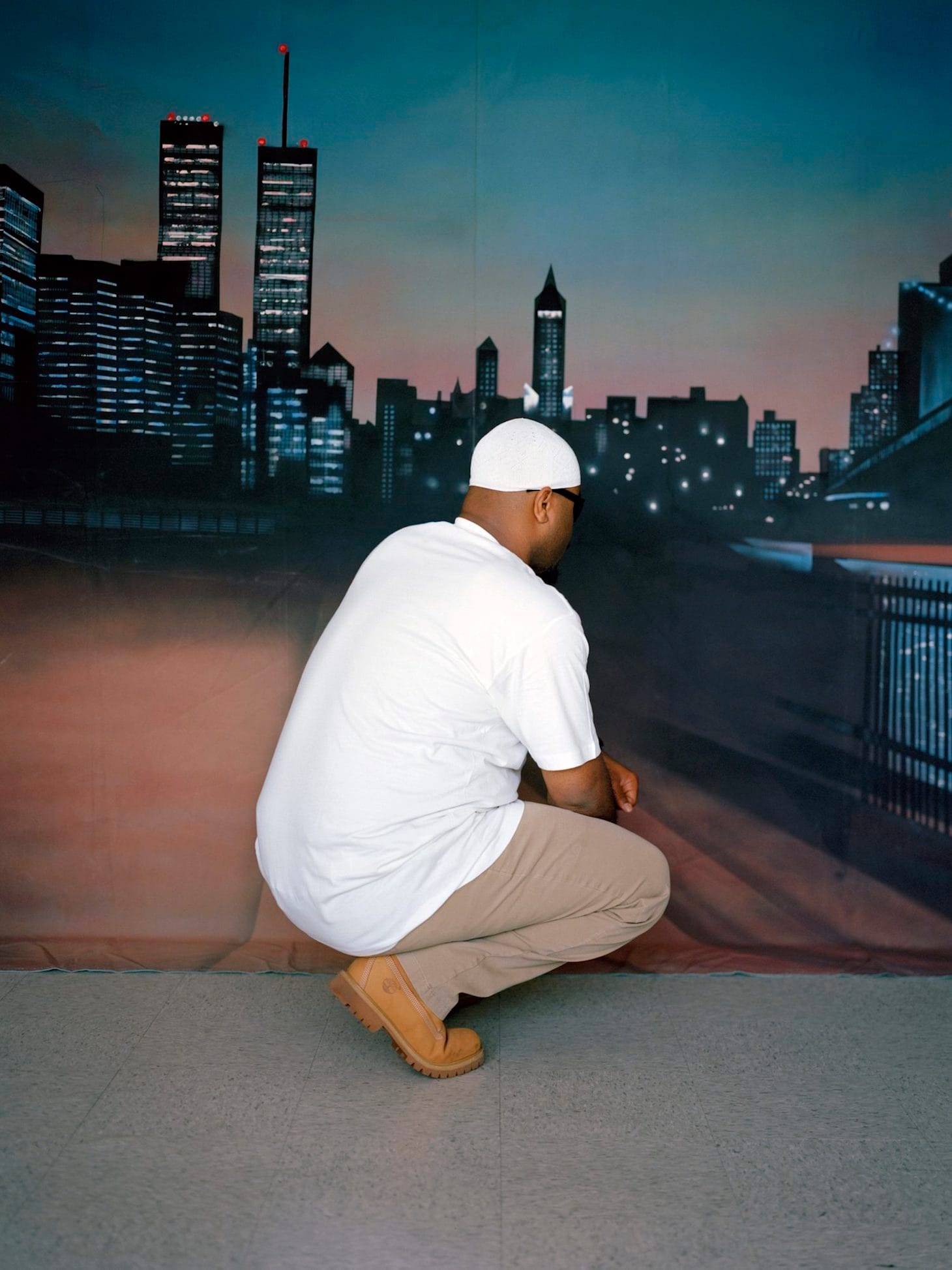 Of the many unforgettable works in Marking Time: Art in the Age of Mass Incarceration, Larry Cook’s The Visiting Room (2019) undeniably elucidates the significance of the carceral gaze. Cook’s figures, dressed in their finest, have been staged to face away from the camera, their backs to viewers. Within many prisons, the visiting room is a rare space where incarcerated individuals are permitted supervised time with their families. Family portraits are often encouraged in front of a simulated backdrop — an ocean view, or a car flanked by moonlight — adding another layer of fabrication to such instances of quality time. With this series, Cook disturbs the surveilled construction of family time within penal space by asking his sitters to turn their backs, creating a vehicle for measured refusal.