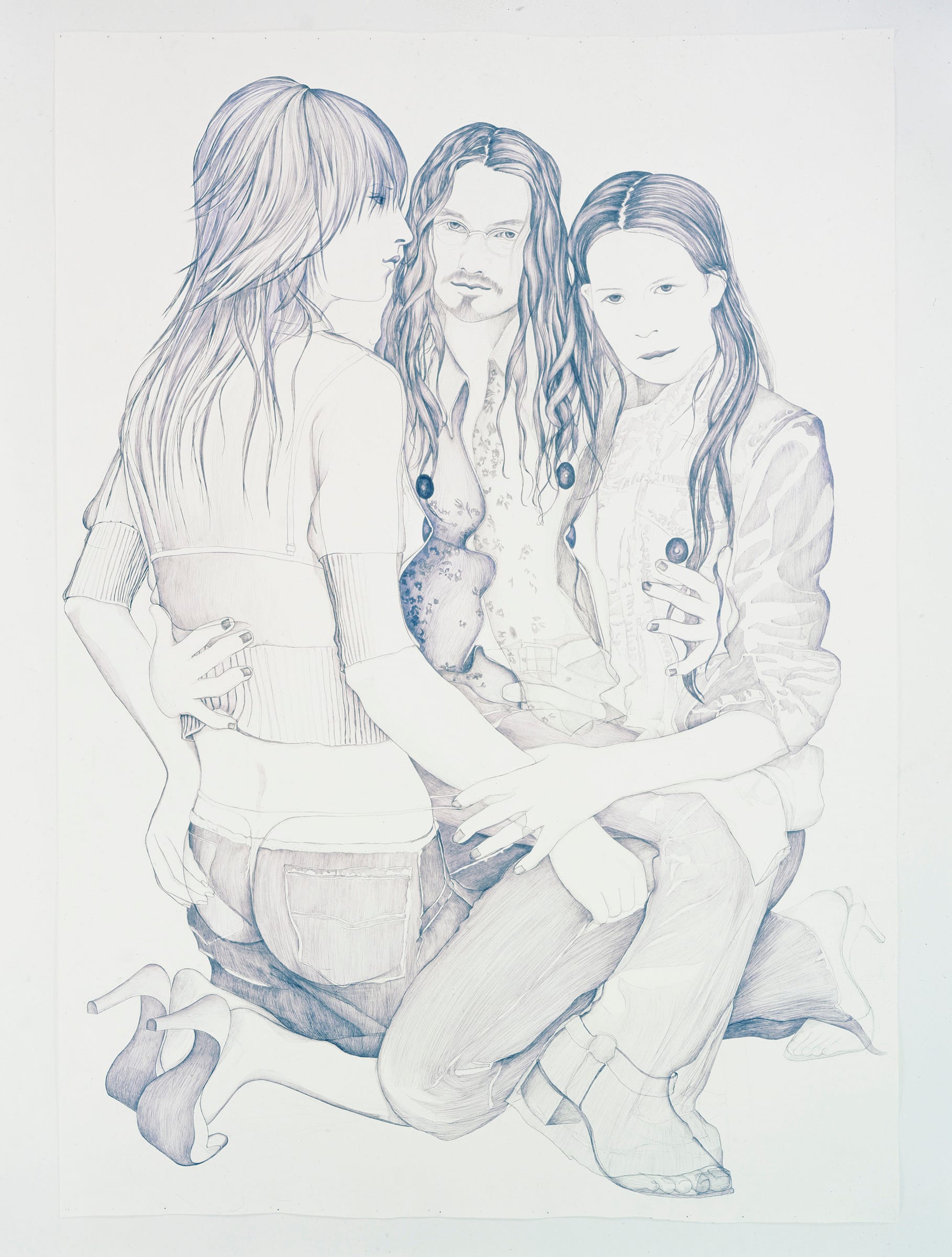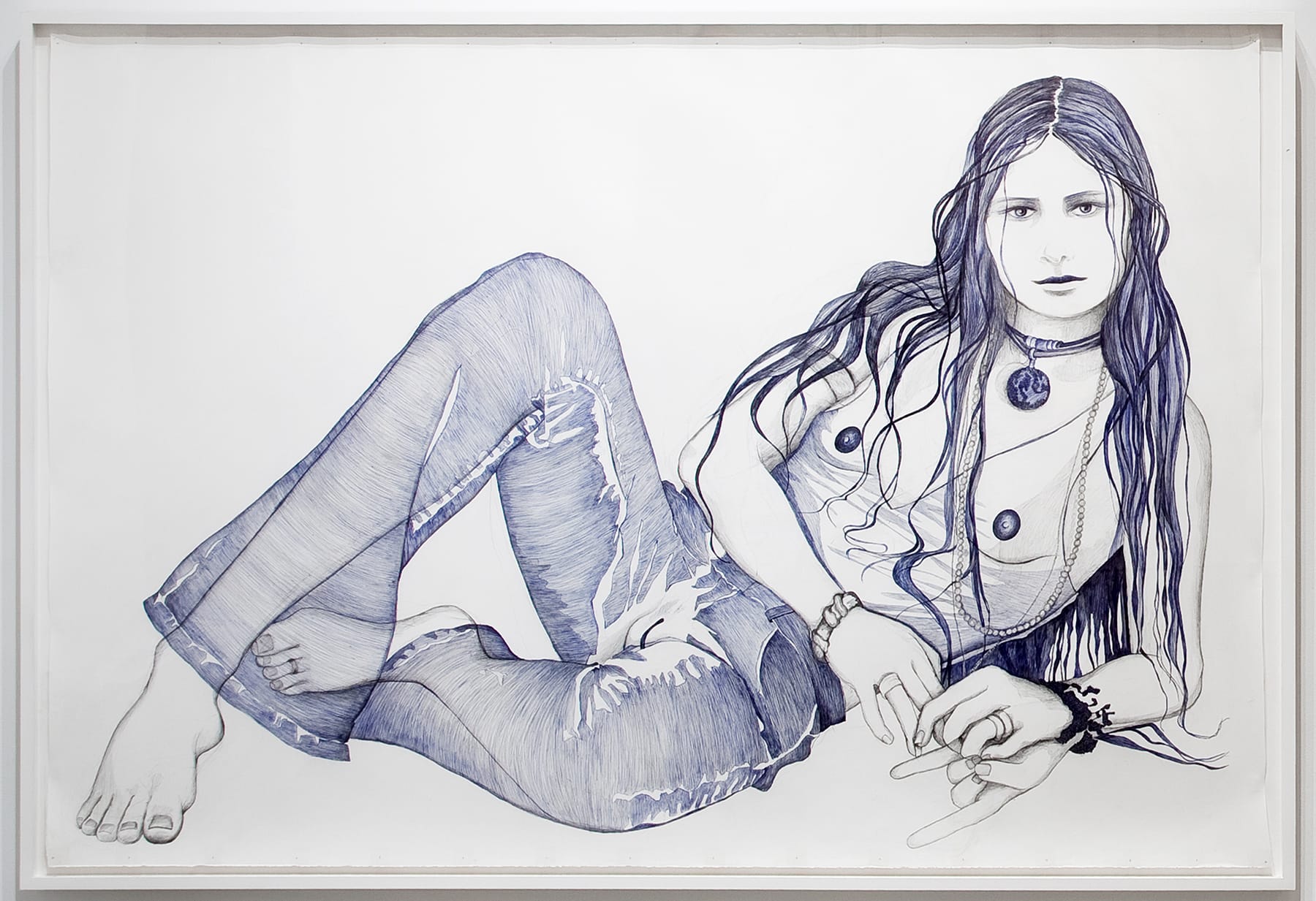 I started making smaller drawings of these women, but they looked like little Barbie dolls. They had to be life-sized or larger, because they had to be in your world, not a small object to look at and not take seriously. I did a couple of drawings just in graphite, but it was hard to get a lot of contrast at that scale, and that’s when I stumbled on the idea of the ballpoint pen. It’s so generic and so a part of the world. Using a ballpoint pen and pencil was a way of recording ideas, thoughts, concepts … It was not about visual sensation. There’s something spectacular about oil painting. This was not that, and I liked that. That’s how I wound up sticking to the material, even though it just about kills me.