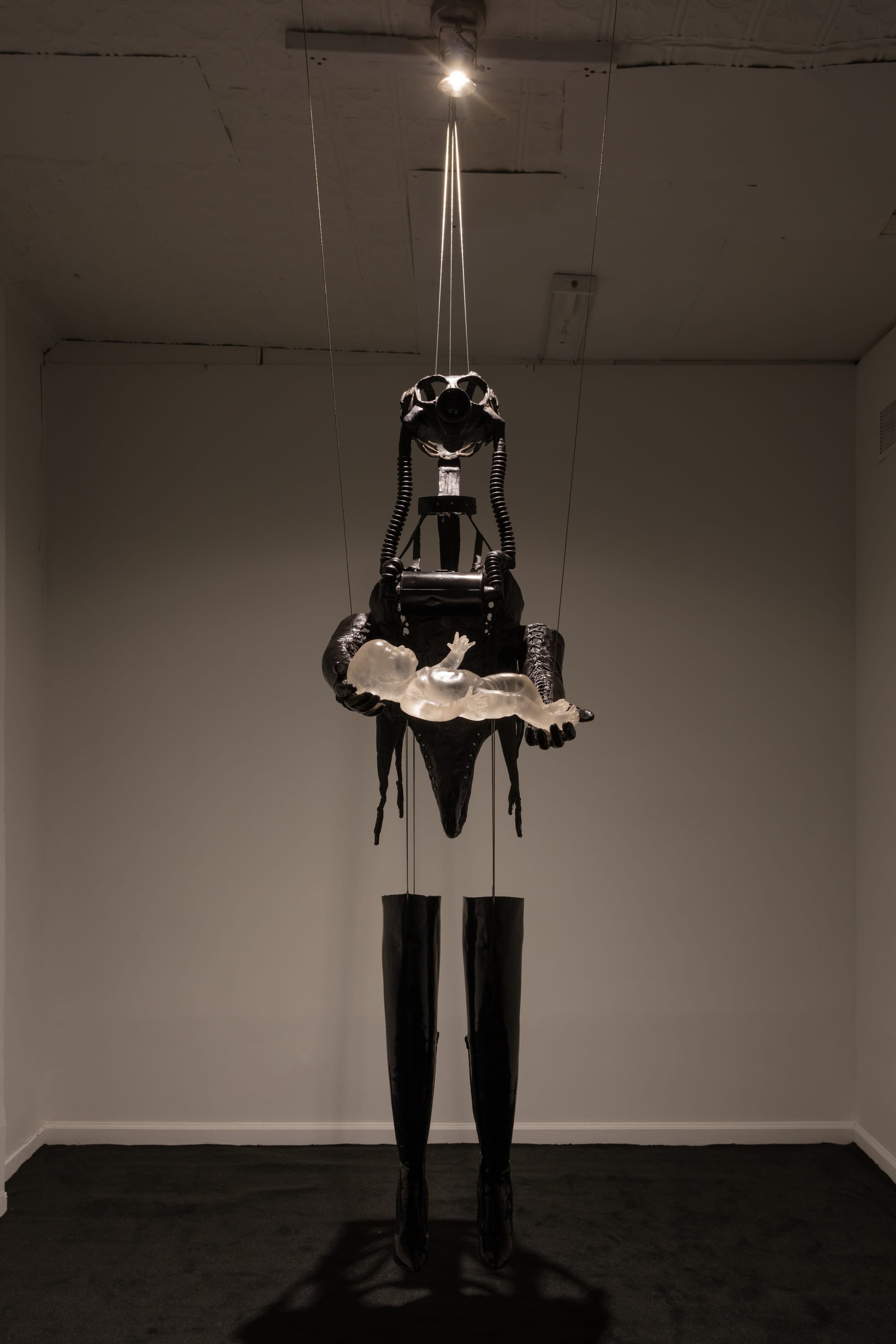 In a more cloistered space behind a partition, a dangling humanoid figure assembled from cast bronze fetish gear — gas mask, lace-up gloves, corset, and stiletto boots, strung together with wire— holds out a crystalline baby, a modern-day pietà. Made in the wake of a miscarriage, Pels's “Pieta” (1998) brings the material language of monuments to a messy maternal tangle of power relations, sex, and loss, in this world that so often takes without asking.