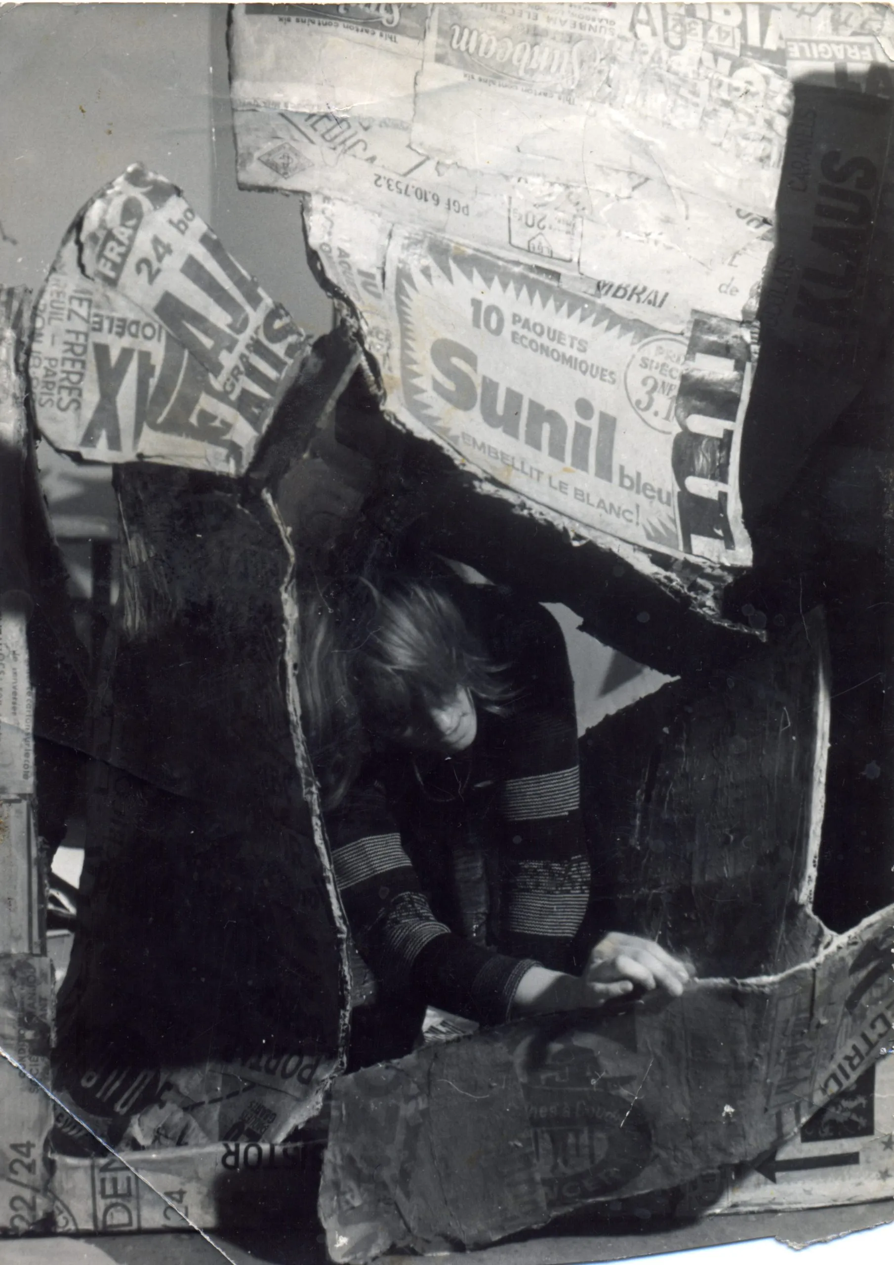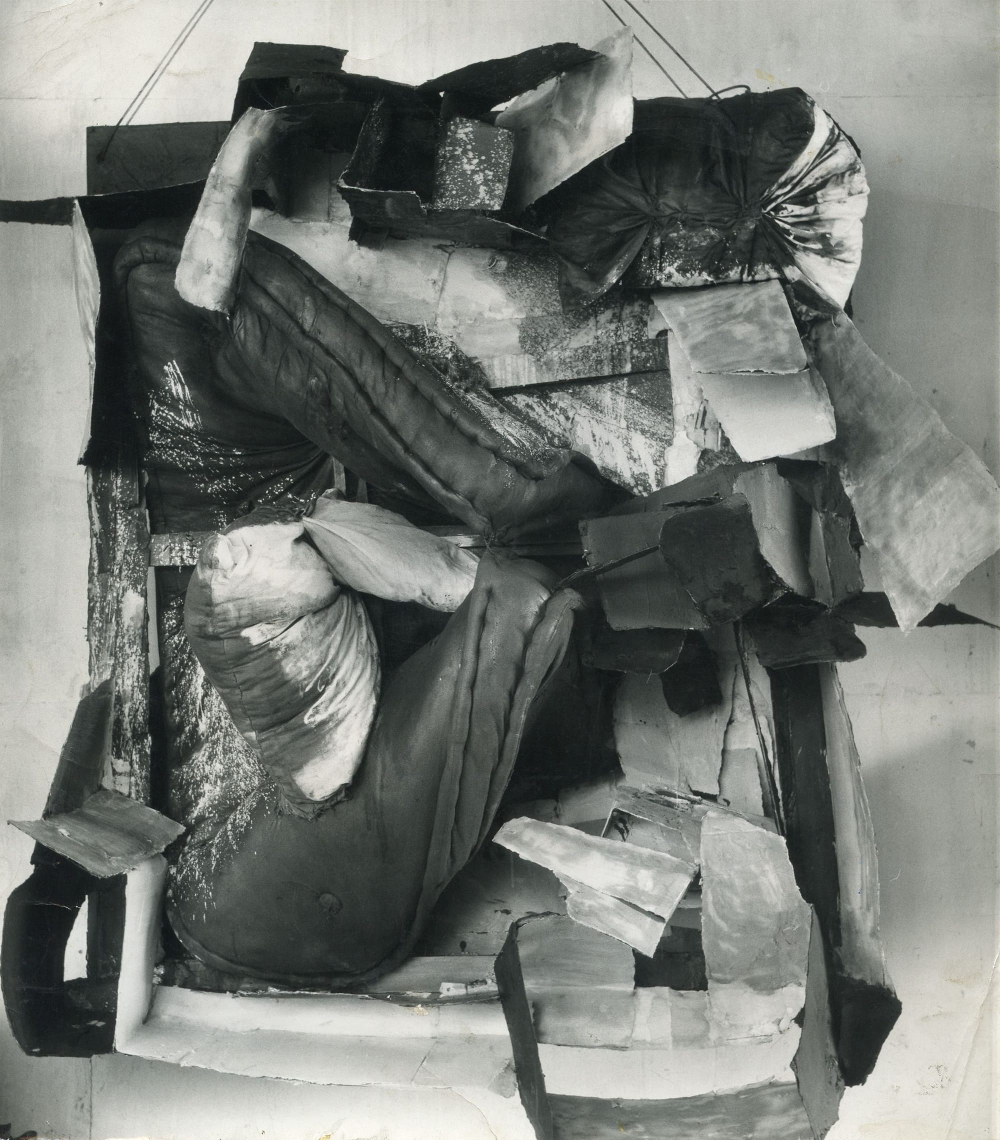 Subsequent photographs of Minujín’s Cartones (Cardboards) (1961-62), sculptures made of cardboard boxes procured from unhoused people who used them as shelters, offer little reprieve. By then the artist was residing in Paris in less than substandard housing conditions, unable to afford oils and instead using toxic industrial and car pigments in her artworks, which she lived with in a small space. The photos show the cartons collapsing onto themselves, twisting and bending at unsightly angles like wailing faces. In some of these sculptures, Minujín began incorporating soiled mattresses discarded by hospitals, explicit invocations of the body and of the human right to rest and refuge.