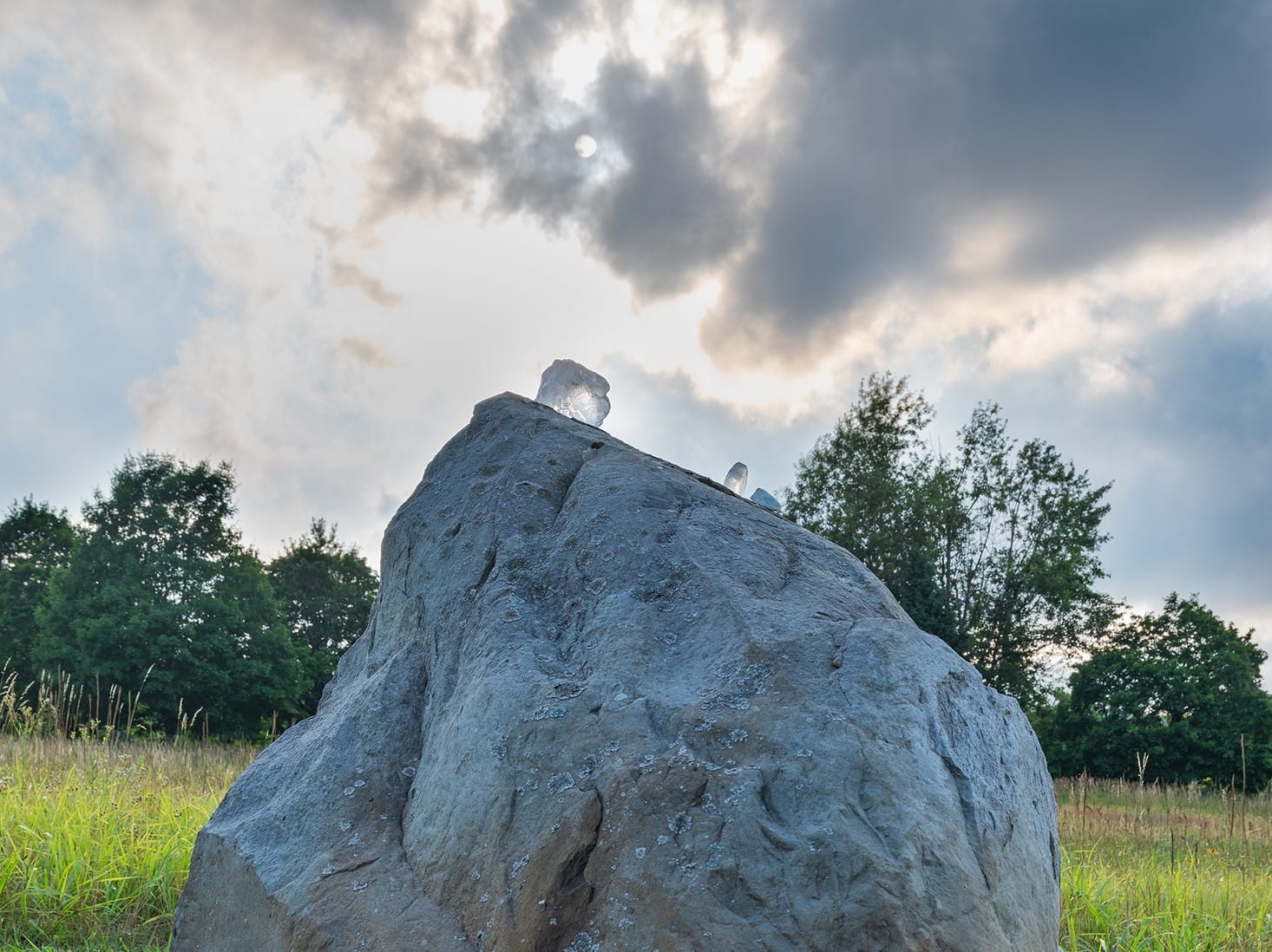 From the gravel road nearby, a sunny grass clearing evokes a golf green surrounded by tawny rough. The boulders haphazardly situated inside the clearing, most of them perfectly sized for sitting, appear at first as indistinct specks, then come into focus as the viewer approaches. The boulders’ light- and mid-gray surfaces seem flecked with white dots that eventually cohere as sculptures of small stones, stacked atop the boulders to form mysterious cairns. The sculptures play with the sunlight in a way that is akin to Enceladus, an ice-covered moon of Saturn that, the exhibition plaque explains, is the most reflective surface in our solar system.