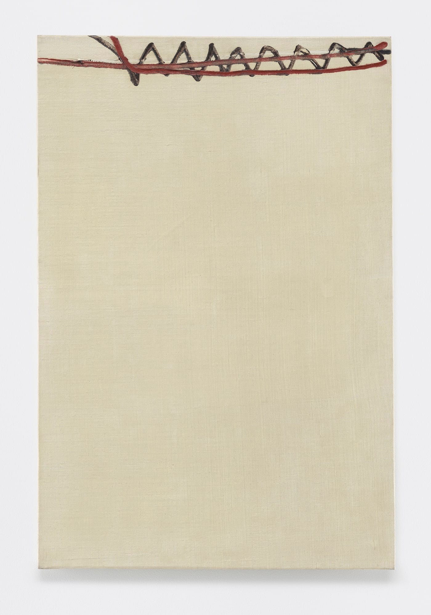 The other thing that Barré rejects is the whole Western notion that a painting can be either a world (or object) unto itself, or that it can be a window looking towards paradise. In “61-T-2” (1961), relatively straight lines intersect with zigzagging ones along the top of the painting, seeming to start beyond canvas’s edges. We are seeing part of something that cannot be deciphered: it is neither purely optical nor insistently visceral. To further complicate our response, Barré has employed an unappealing palette of reddish-brown and mixed gray and left much of the painting empty or unmarked. The lines running along the top of this vertical painting are like the title of a disquisition that cannot be written.