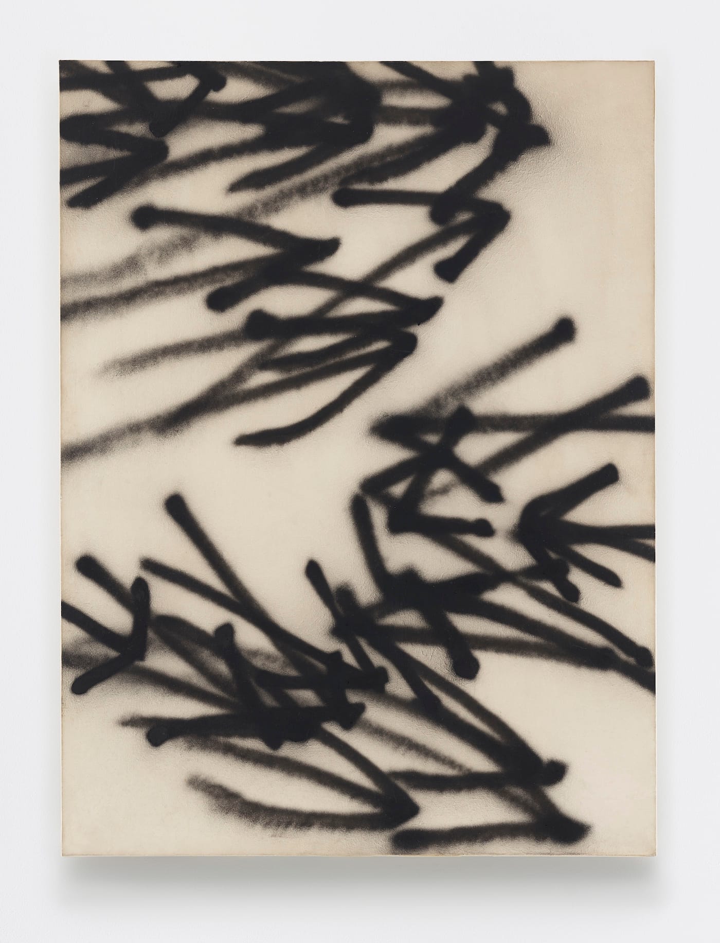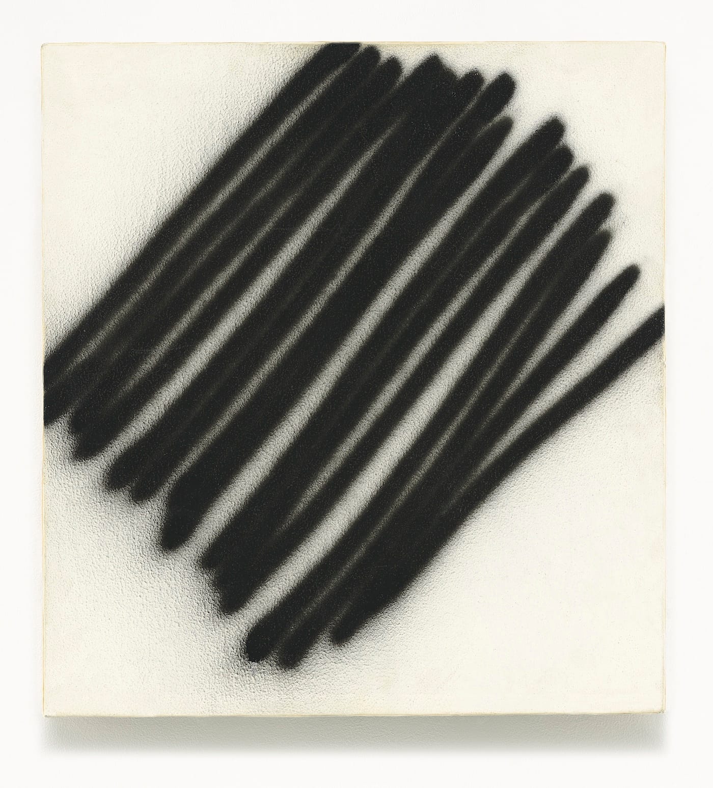 Two years later, in “63-F-5” (1963), flocks of arrows extending inward from the canvas’s vertical edges point right, left, and down. I think it is telling that none of the arrows point upward. In all four groups of paintings in the exhibition, Barré is directing our attention beyond the canvas’s physical edges. I would say this is also true of the Zebra paintings, such as “67-Z-21” (1967), in which some of the diagonally arranged sprayed lines, with their feathery edges, extend beyond the painting’s borders. It also seems as if the off-white ground has been applied with horizontal brushstrokes over a previous layer of vertical black marks. The layering is Barré’s way of marking time, which is another way he stands in opposition to the American idea of presence, timelessness, and taking in a work all at once.