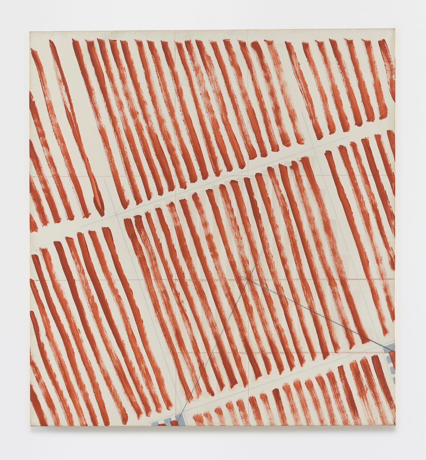 Barré’s interest in layering, line, drawing, and painting comes to another sort of fruition in the hatch paintings of the 1970s. In each of the series I have discussed so far, we see Barré rejecting the seductions commonly associated with the material sensations of paint — opticality, weight, fleshiness, color — without settling into a style. Throughout his career, Barré seems dedicated to derailing our expectations; he refuses to the binary choices of symmetry or asymmetry, all-over or relational. He always reminds us of the layers that remain hidden and that what we see is a fragment of something we cannot picture in its entirety. I doubt his intention in these matters is purely formal.