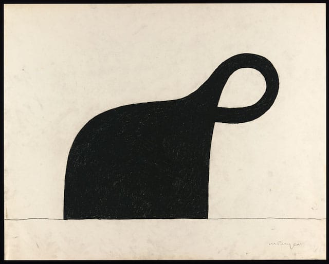 The sculpture is an elongated head lying face-down on a pedestal. Its shape recalls a Fang Ngil mask worn by members of a secret society of judges. The silvery patina of the white bronze reminded me that the masks were covered with the white pigment of kaolin clay, which the Fang people believed to be the color of the dead or of spirits. The head’s orientation makes it appear as if the mask’s face is sunken into the pedestal. Puryear has hidden the face (that is to say, the part that Picasso and other European artists had appropriated); he has both given it a proper burial and turned it into a memorial, all while turning its face away from the viewer. The neck, a cylindrical form extending up at a slight angle, can be read as a handle, implying the object might be used for an unstated purpose. Finally, might not “Face Down” also be seen as Puryear’s response to Brancusi’s “Sleeping Muse” (1910) — one archetypal form talking to another?