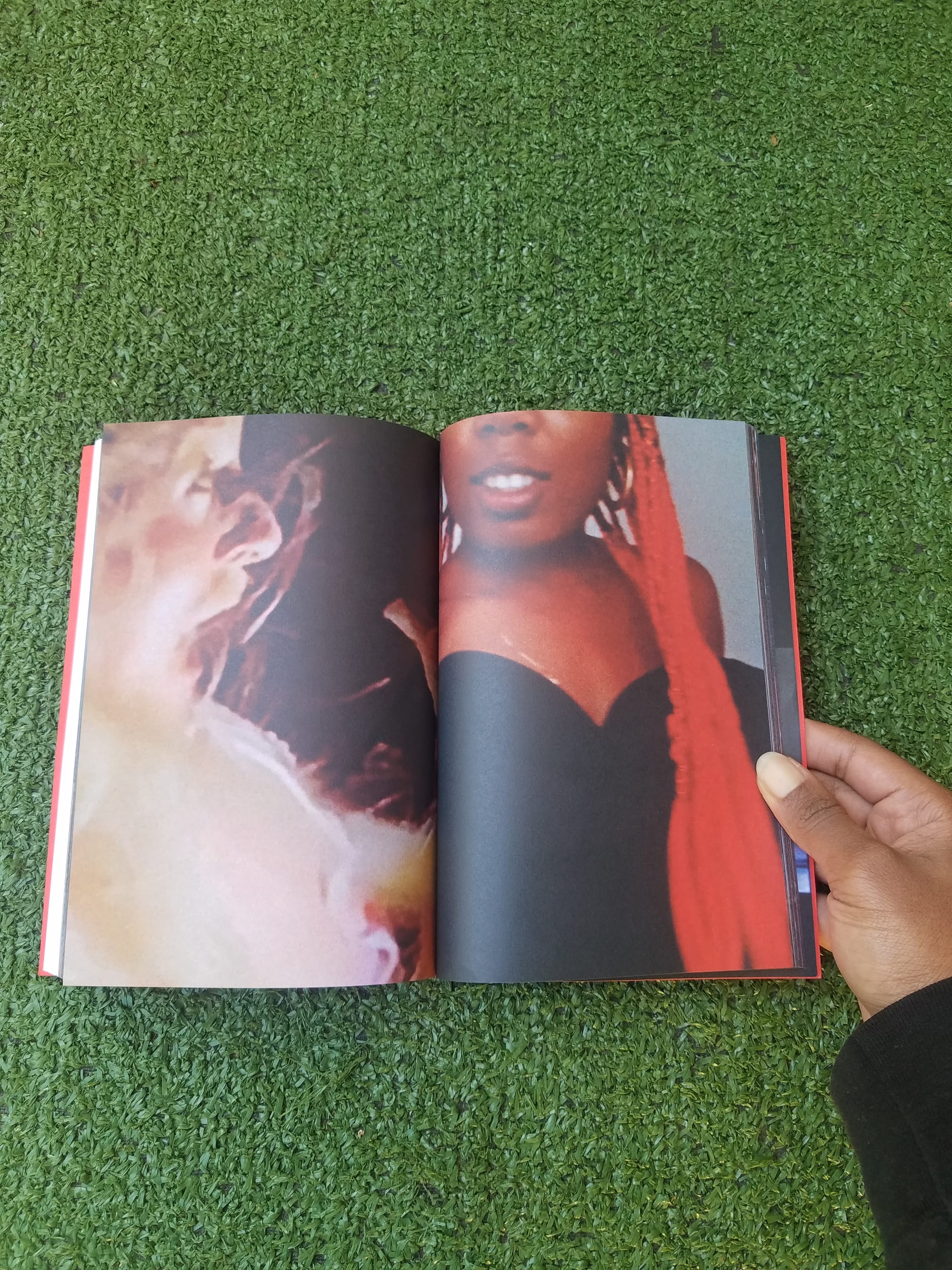 The confessional, wry text appears alongside a rush of images from Syms’s recent video installation, Ugly Plymouths (2020). The grainy stills show tropical getaways, club excursions, live music footage, soccer games, and selfies of Syms sporting cherry-red box braids and various weaves. Upon first read, it may seem as if we have been granted unfettered access to her roving thoughts and moods. Who doesn’t want to be privy to the private desires and fears of an ambitious, jet-setting artist and thinker? But the mysteries of Shame Space expand when you approach the book less as an exercise in autobiography and more as an irreverent performance of contemporary living.
