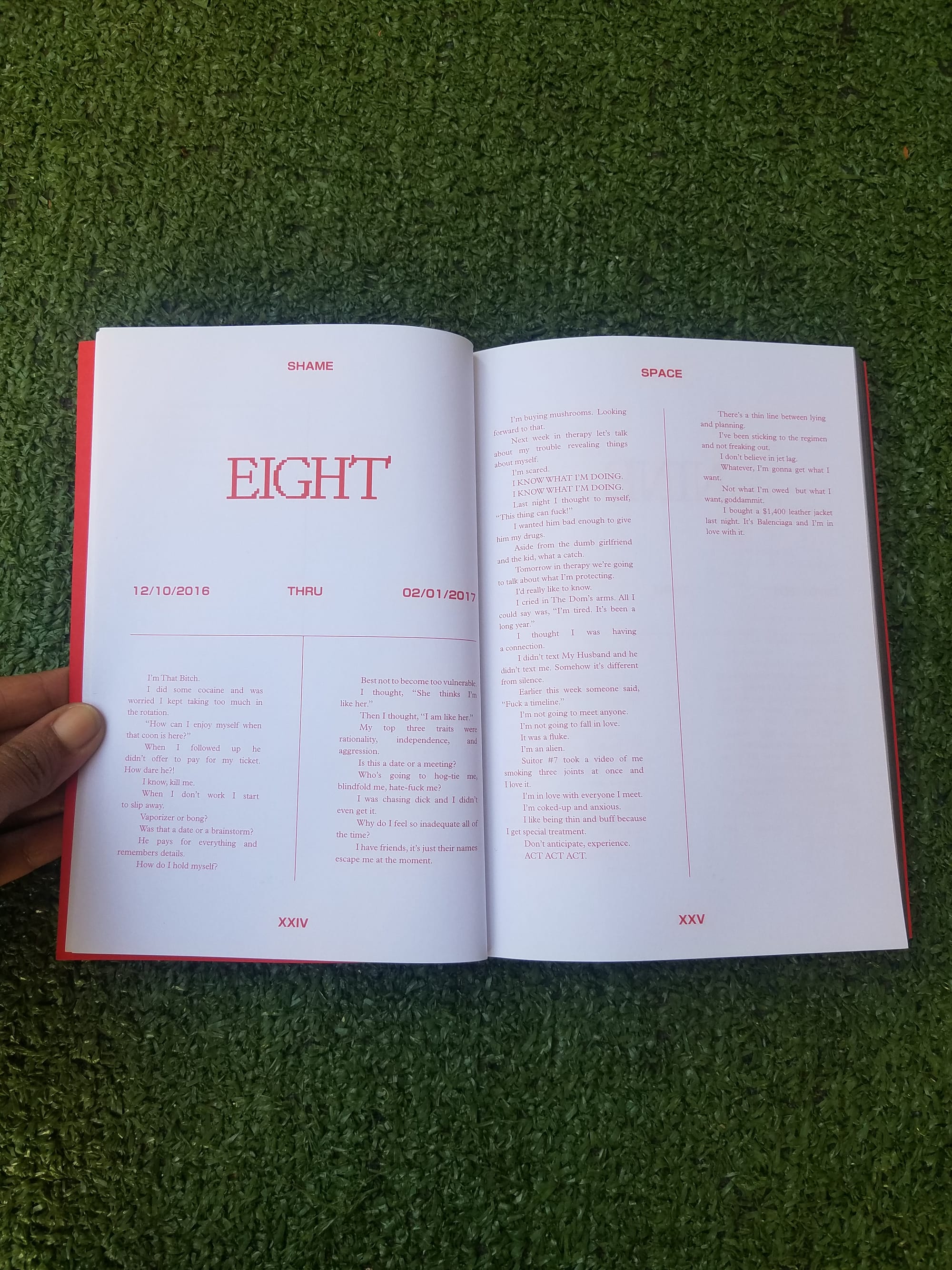 The first half of the book presents a loose narrative in the form of diary entries from 2015 to 2017, which were sourced from Syms’s own journals during that period. Divided into 15 chapters, the narrator obsesses over sex, money, fitness, drugs, friends, work, and self-hatred. “I feel stupid writing this shit down, but I have to get it out,” she reveals before cataloguing career highs and personal quagmires. The cadence of her words invokes our digital-mediated world, reminding me of catty lines from a juicy group text thread or excerpts from an earnest social media post.