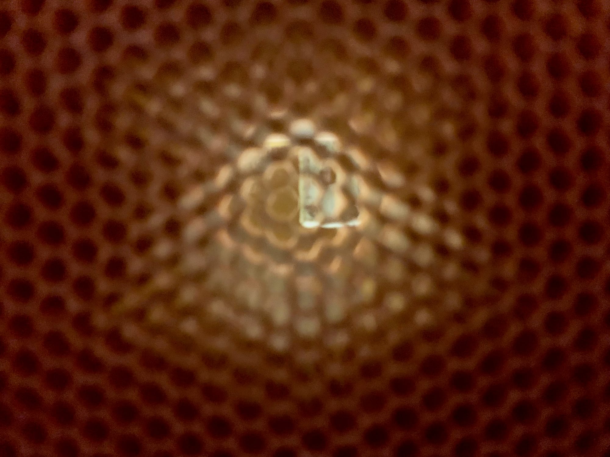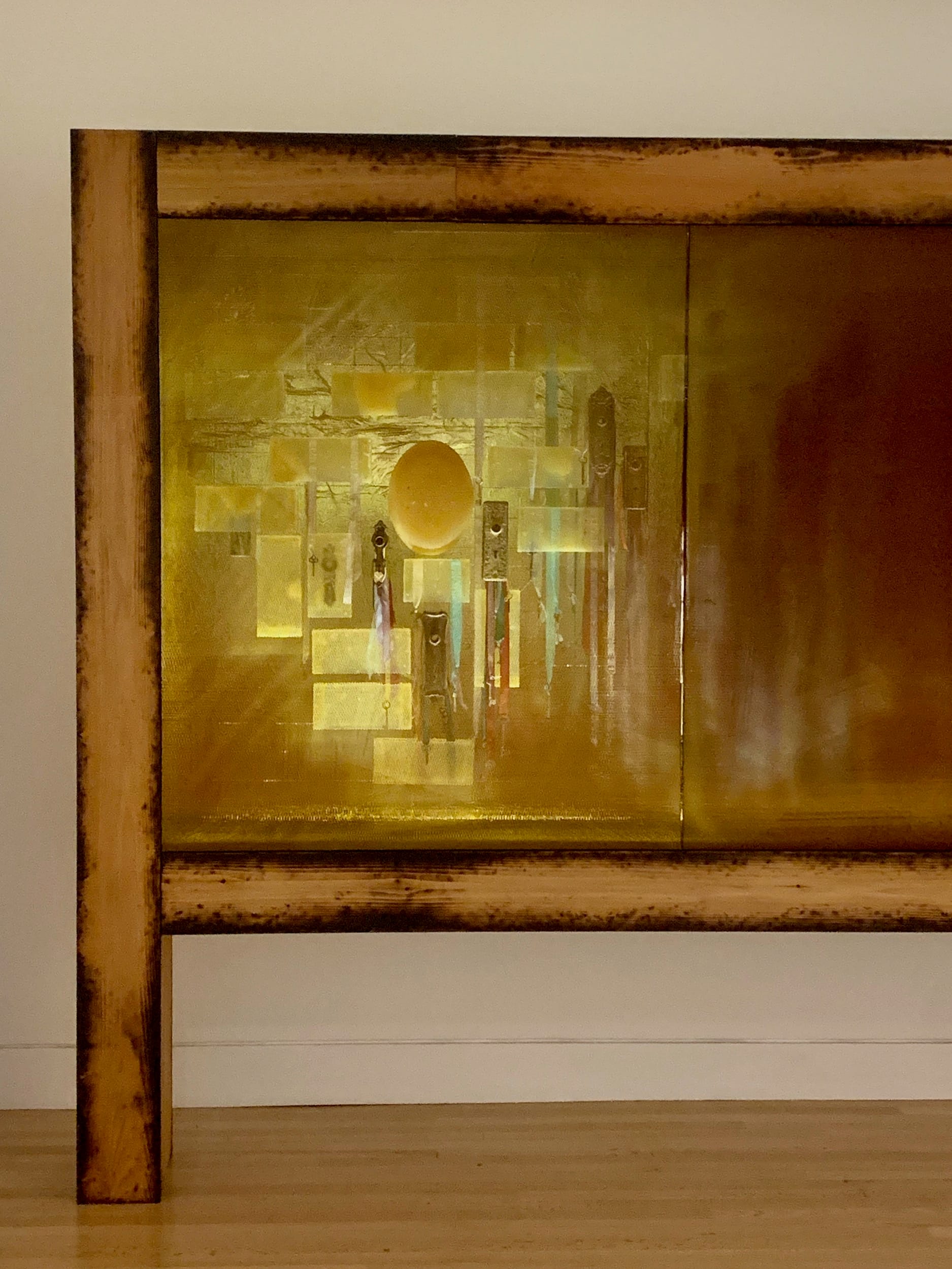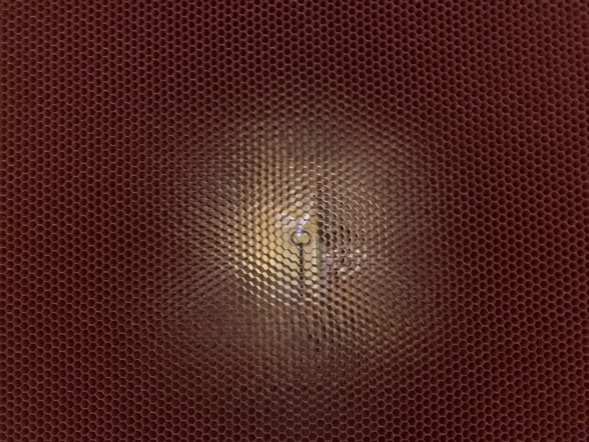A subtler tour-de-force is “impossible monument: gilded” (2024). This upright rectangular chamber, in a heavy wood frame, looms large, taking up most of one gallery alcove wall. It holds a set of objects obscured behind a mesh-like fabric grid whose patterns allow partial glimpses of what’s behind, depending on a viewer’s position. The striking elements within the frame include ribbons, keys, door lock plates, and laminated survival blankets, all seen through the dim yellowing light of aramid (a honeycombed synthetic fiber fabric) — as if suspended in amber.