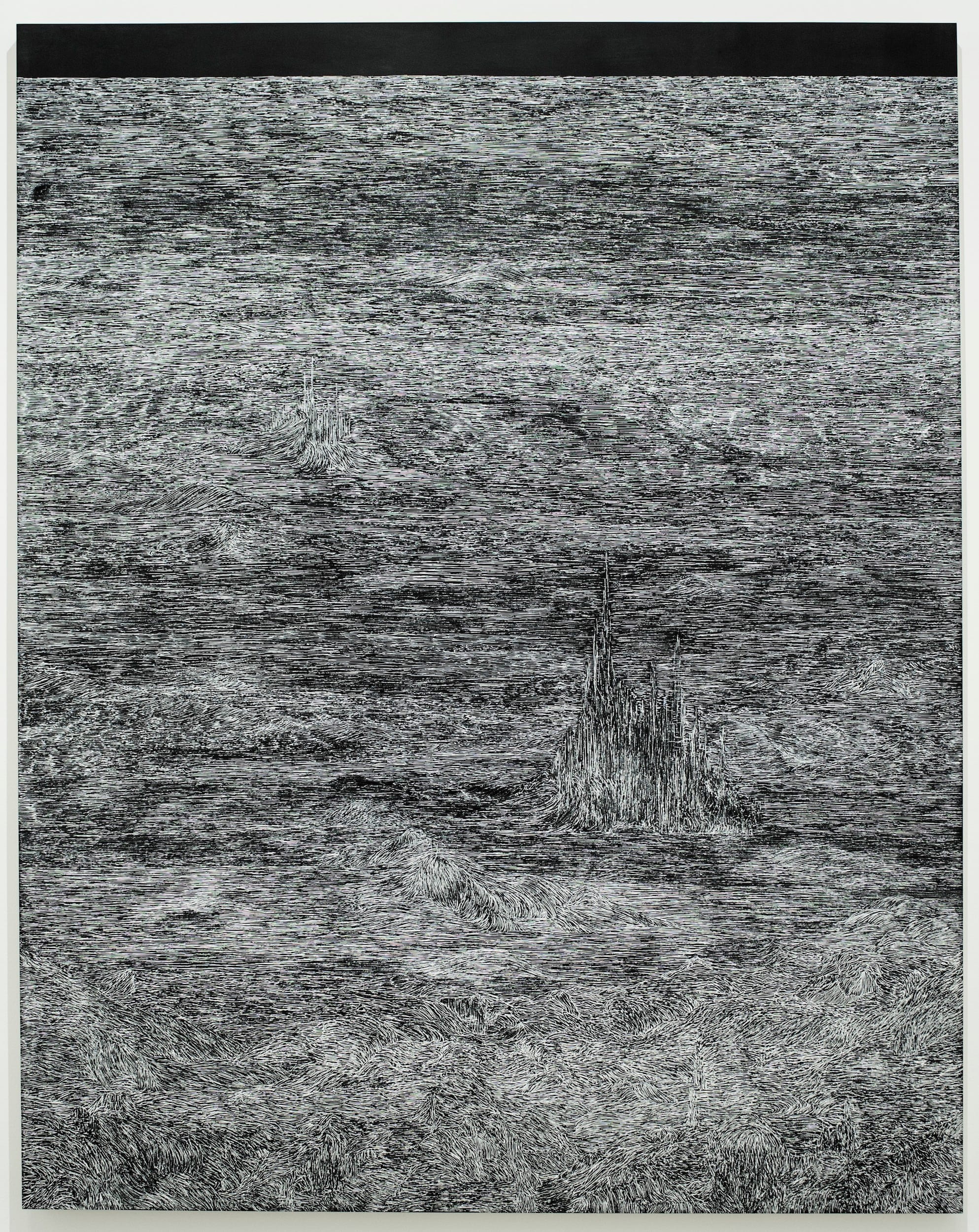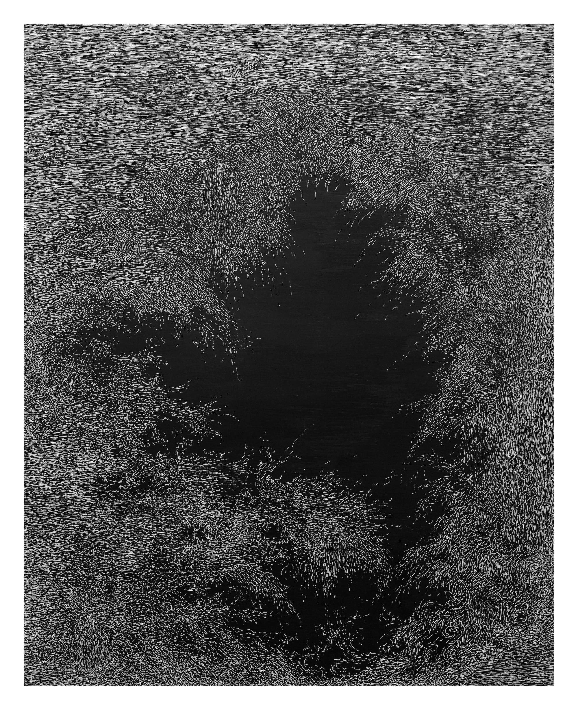 In “(the hollow)” (2021), short, fine dashes swirl and rotate toward a large dark void exciting the apparent direction of the lines while sucking them in via its gravitational power. “(echo)” delineates more complicated topographies. A darker band near the top establishes a horizon line above a sea, a set of different fields, or low mountain ranges — or combinations of all. Amid these, spiky geological formations seem to rise up out of vast swathes of liquid bodies.