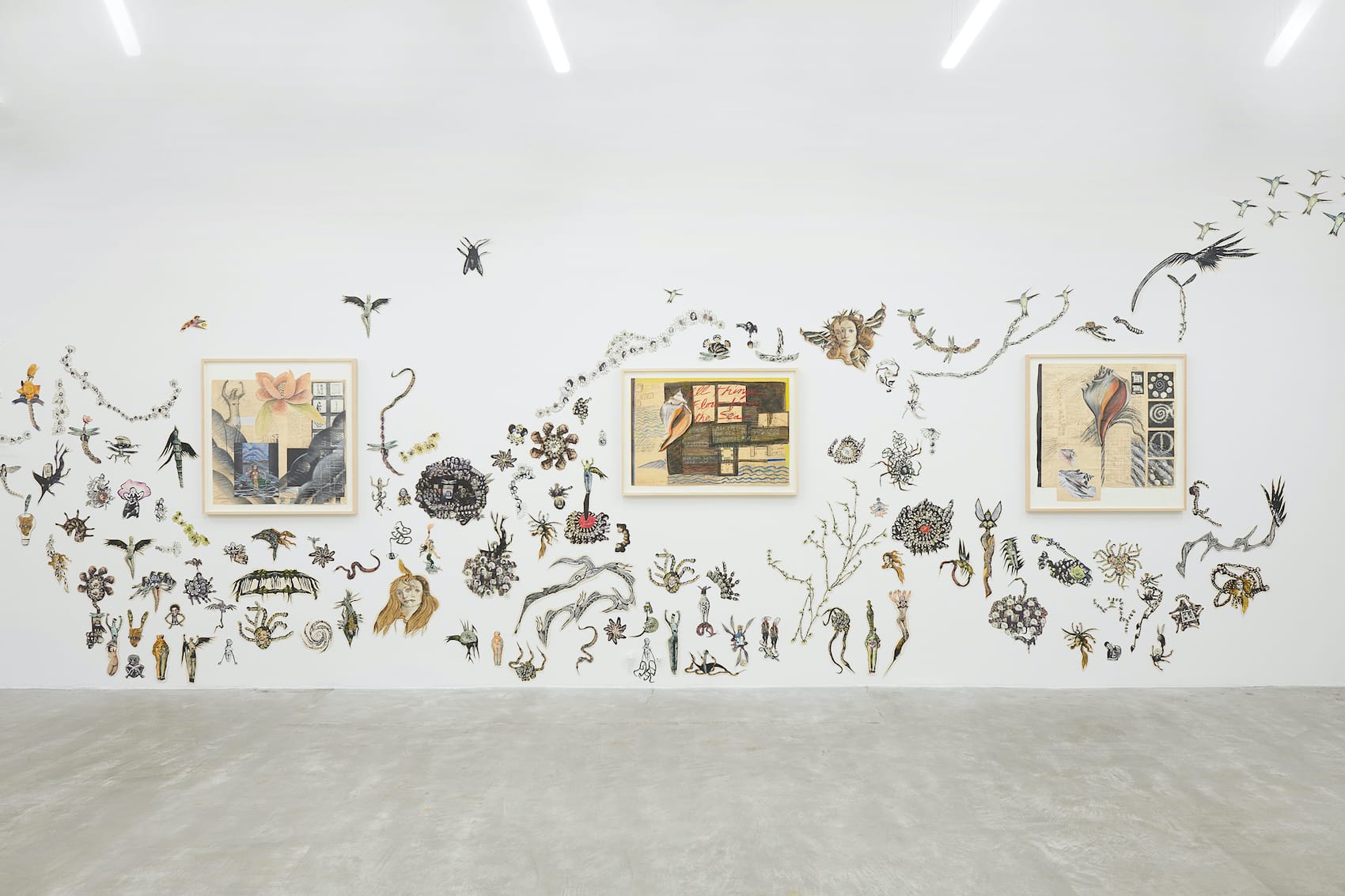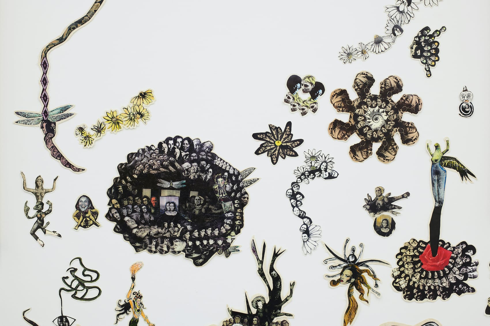 Mary Beth Edelson: A Celebration at David Lewis Gallery, a compact presention of Edelson’s biodiverse feminist art, trills with a flair that’s unmistakably hers. Filling the gallery’s two-room space is an assortment of collages on canvas that the artist, who died in 2021 at the age of 88, produced from 1972 to 2011, plus selected mixed-media works from the early '70s and one large acrylic collage-painting. The teeny fly-collages are mounted high on the wall in the front room. The swarm arches up and into the backroom, where collages wind high and low, and mushroom in the corners. The free-form installation in a way echoes Matisse’s site-specific cutouts — an artist Edelson acknowledged as an early influence.
