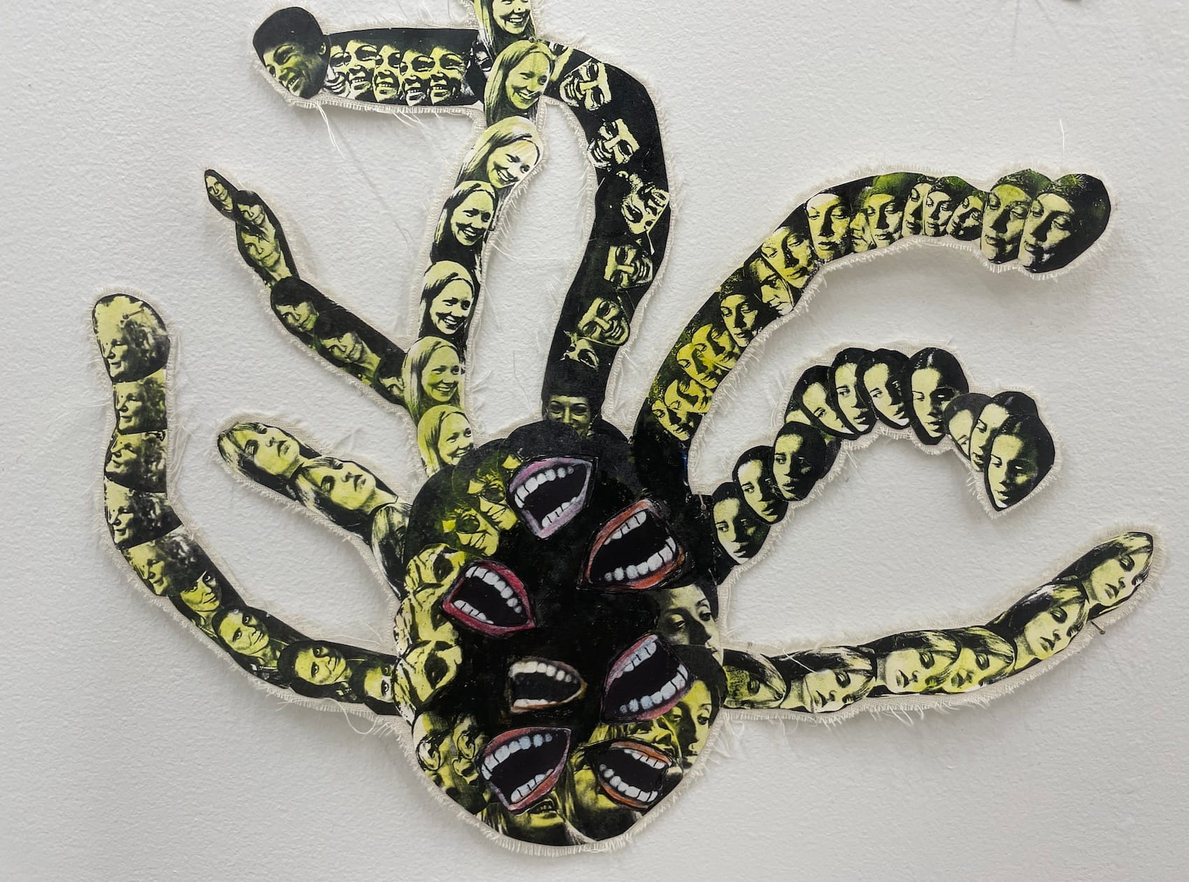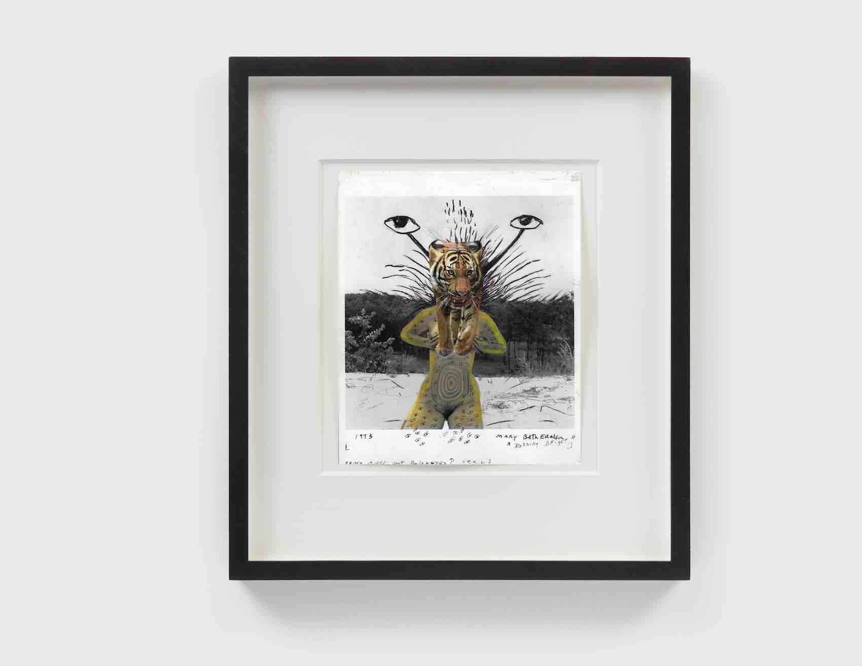 The flies bear faces of women artists Edelson knew or admired. The strategy reflects her most famous work, “Some Living American Women Artists” (1972), what looks like a poster mockup in which she replaced the faces of the apostles in Leonardo da Vinci’s “The Last Supper” (1495-98) with those of women artists such as Yoko Ono, Faith Ringgold, Agnes Martin, and Alice Neel. In the collages, Louise Bourgeois is the modernist fairy fly-godmother, and the bespectacled specimen with a Pentax camera is, I believe, Edelson herself. The effect of these buzzard-women (or artsy gnats?) peering curiously at the visitor is uncanny. In this sense, the flies embody what, in her Artforum essay on Edelson, essayist and poet Dodie Bellamy dubbed “relentless otherness.” At David Lewis, real women cohabit and fuse with flies, medusas, frightful mandibles, and arachno-morphs, but also female deities and mashup fertility and pop-culture idols (Faye Dunaway is easily among my favorites).