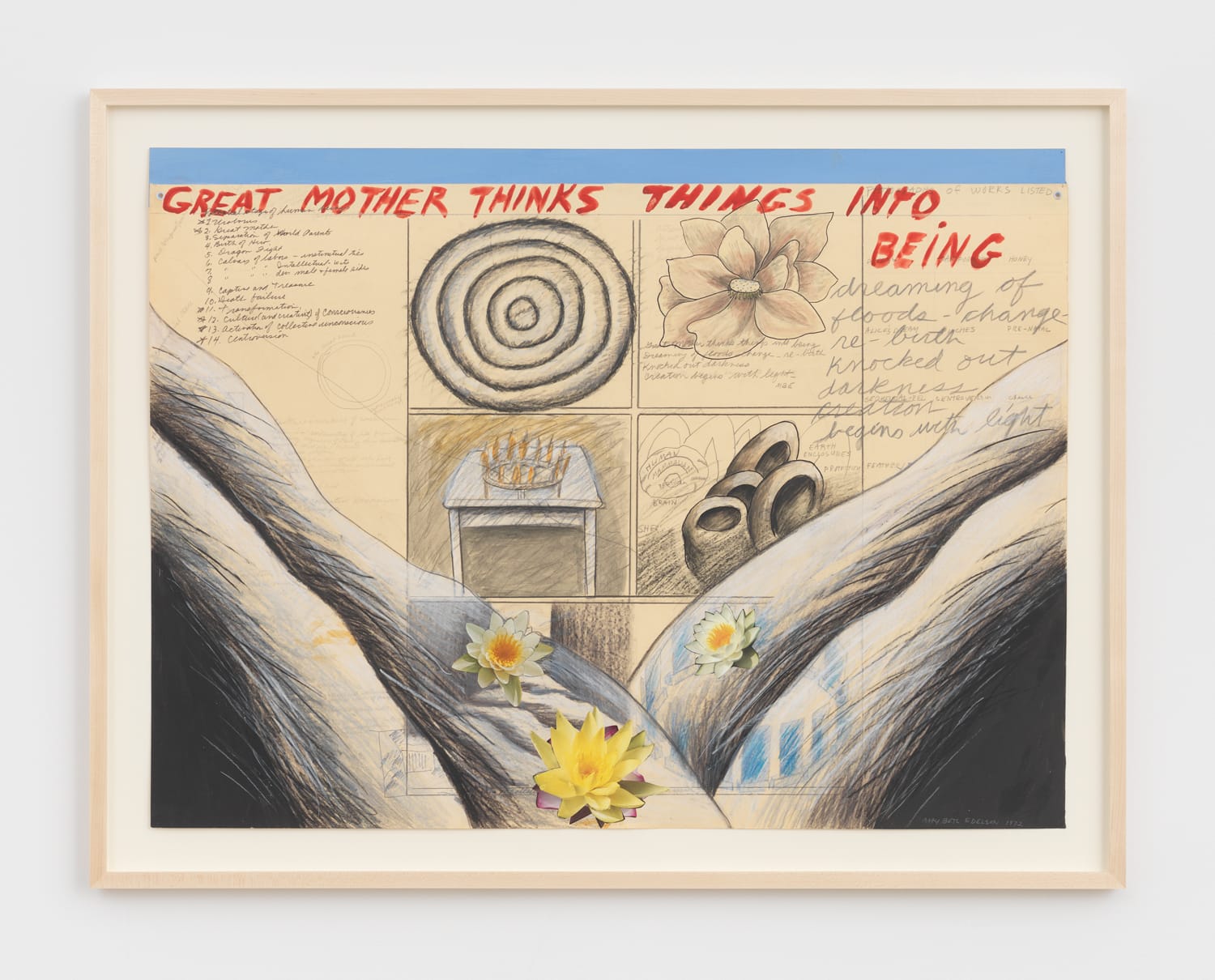 In New York, Edelson began to exhibit at A.I.R. Gallery, a collaborative space run by women artists in SoHo. She also founded the Heresies mother collective in 1977, with art historian Lucy Lippard and artists Joan Braderman, Harmony Hammond, and May Stevens. Mentors to younger artists on the scene, such as Ana Mendieta, and precursors to the Guerrilla Girls, the '70s feminist artists curated communal shows and picketed prominent art institutions, such as the Museum of Modern Art, that sidelined women artists. Edelson’s murals of woman-power are then much more than a quixotic manifesto culled from myriad sources (i.e., Jung, goddess-centered pantheism, or sororal multicultural exchanges with peers such as Turkish feminist artist Nil Yalter). Instead, these works form an ambitious catalogue of feminism and feminist-art history in the making, in the vein of André Malraux’s musée imaginaire. Edelson followed the hunch that if women artists didn’t create this history for themselves, no one would.