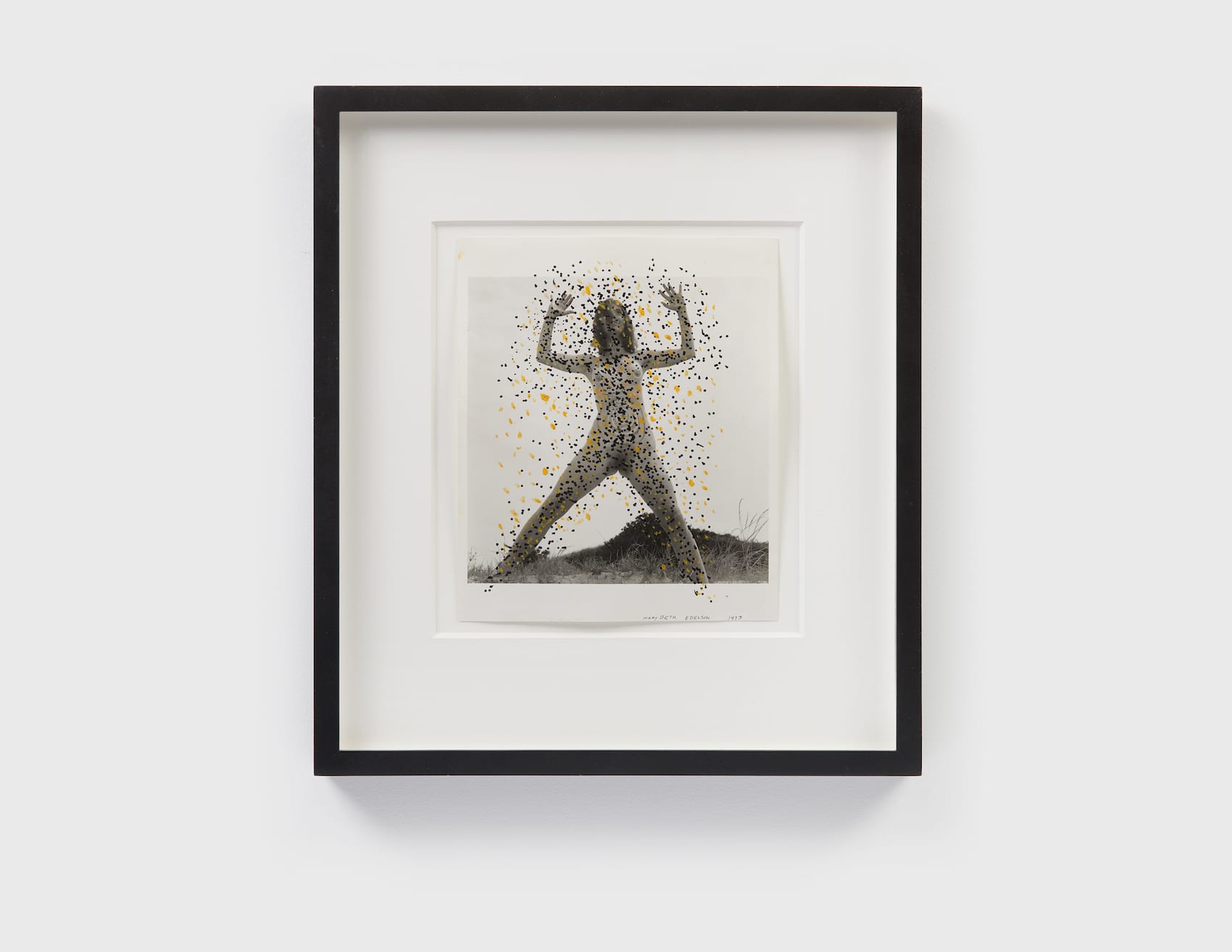Edelson’s work is inseparable from 1970s feminism, particularly its New York vanguard. Born in East Chicago, Indiana, she earned a master’s degree in art and higher education from New York University. After some years in Indianapolis and Washington DC, where she organized the Conference for Women in the Visual Arts, she headed back to the Big Apple. By then, she had produced her seminal series Woman Rising, in which the artist used oil crayon, ink, and collage to ornament nude black and white self-portraits with symbols and masks. Two, “Dematerializing / Trans-DNA” and “Burning Light” (both 1973), are included in this exhibition. She said in interviews that she made the series to assert her sexual independence. No doubt her creative independence too, as she continued to make art through marriages and childrearing. In “Dematerializing / Trans-DNA,” her lithe body, arms raised so that her torso looks like a pitchfork, vanishes behind a black and orange swirl. Edelson was moving further into conceptualism, but she had a cartoonist’s sensibility for graphic shorthand and sly humor: The dots look like a swarm of colorful insects hatched from the artist’s sex, once again tying insects to women’s bodies, and art.