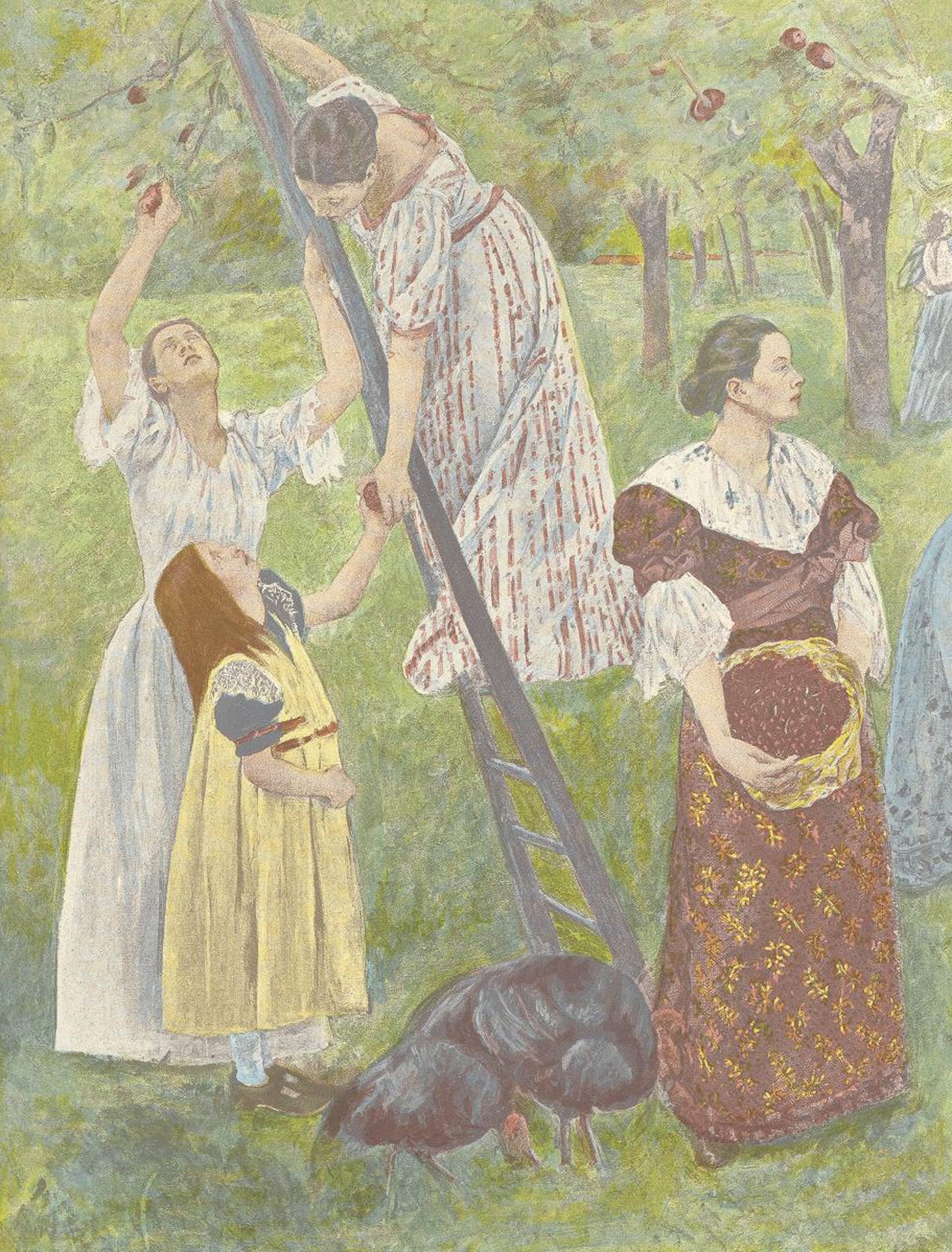 Situated in a vast interior courtyard, Cassatt’s mural was monumental in ambition and size, about 60 feet long and 14 feet at its highest. It consisted of three panels, which show women pursuing (left to right) Fame, Knowledge, and Art. The largest scene, “Young Women Plucking the Fruits of Knowledge and Science,” filled a massive center lunette. Depicting contemporary women in an apple orchard, it’s ostensibly tame stuff. But the Tree of Knowledge of Good and Evil, and its fruit, appears in the Bible and in Western art for thousands of years with women depicted as the agents of man’s fall from grace. Cassatt’s painting doesn’t include men at all. Women pluck apples and pass them down to younger girls, one generation feeding another the wholesome fruits of their own labor.