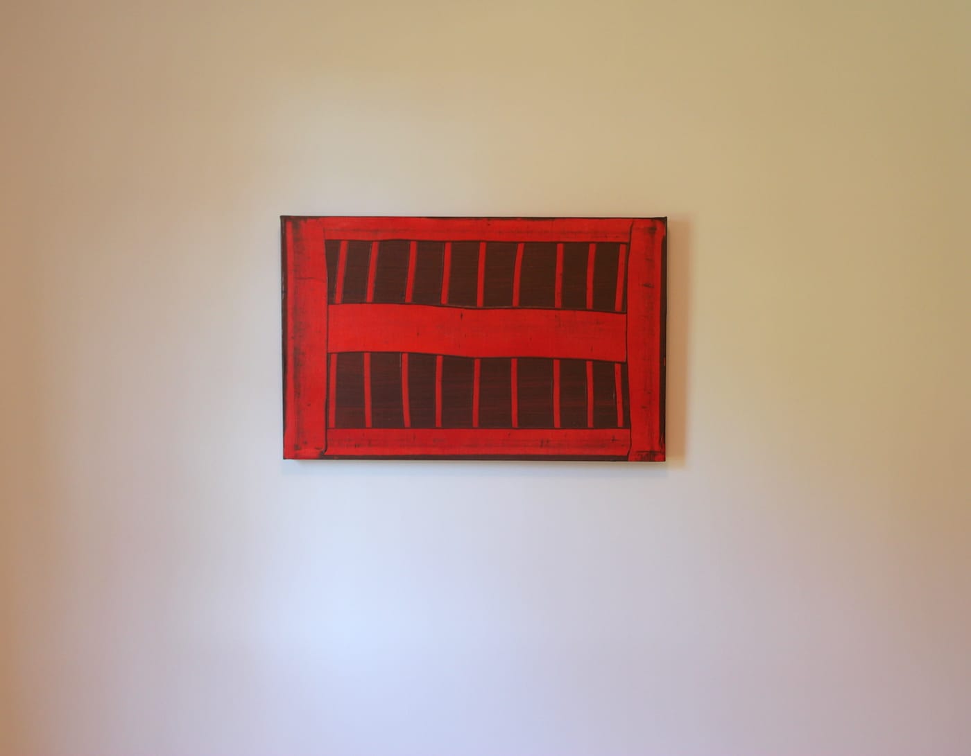Take “The First Vent” (1972), the earliest work in the show. The painting looks fairly innocuous, familiar even. It’s a horizontal grid, rendered in smeary brown paint on a red background. In abstract painting, grids are often used to hold the viewer’s attention on the surface of a canvas, marking its limits and reasserting its nonrepresentational status. As Flavin might have said, the gridded picture “is what it is and it ain’t nothing else.” Yet “The First Vent” is something else. The picture is a 1:1 scale representation of the air vent in Heilmann’s studio. Taken as such, the trope of the grid is trivialized: not only is the work slyly representational, but it reminds us that a painting is simply one mundane object among many. “We all hated painting,” Heilmann wrote about her time in the New York Scene in the late 1960s. “Even me. So I started making paintings that sort of dissed painting.”