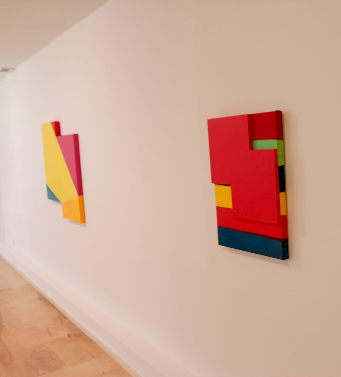 This all changes, however, when you step downstairs into the temporary exhibition space. A row of domestic ceiling lights half illuminate a few smallish paintings and ceramics. The show, Mary Heilmann: Painting Pictures, immediately feels jarring. Like Flavin’s neon constructions, the works are brightly colored and ostensibly geometric. But something is off. Colors bleed between planes, pinks and reds clash, paint extends over the edges of the stretchers. The objects are unwieldy, physical, and decidedly messy.