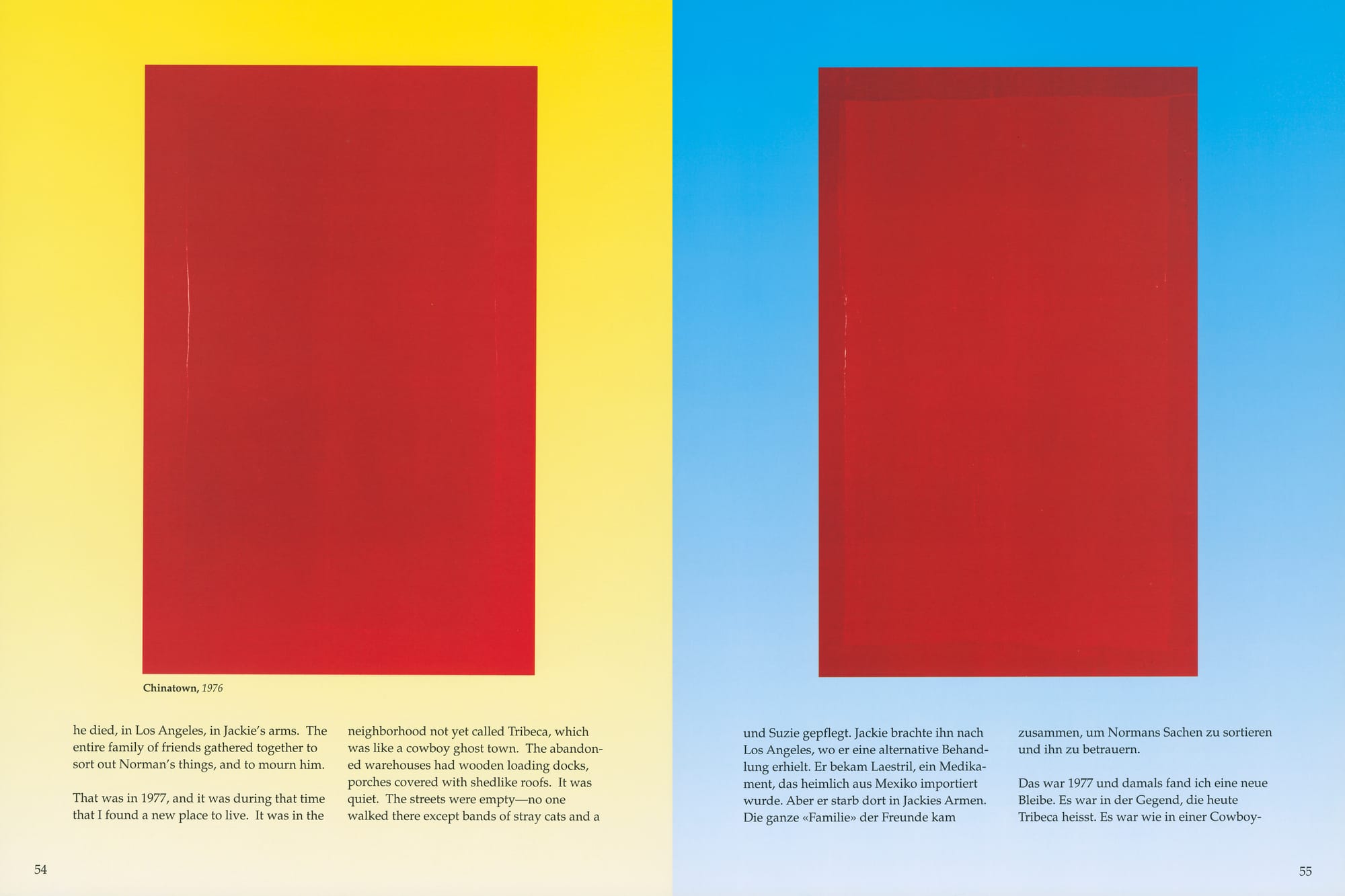 First published in 1999, The All Night Movie has recently been reissued by Primary Information. Designed by Mark Magill and Heilmann, with an essay by artist Jutta Koether, the book pairs the acclaimed painter’s personal account of her life with corresponding images of her work, as well as childhood pictures and photographs of friends and peers. The book’s design serves as an extension of her practice with space, color, and composition — overlapping the works, scaling them up and down, creating an immersive collage effect. Barring a couple of exceptions where the overlapping imagery and words impede legibility, the design adds to the overall reading experience. In a 1999 interview with artist Ross Bleckner for BOMB Magazine, Heilmann said that “The pages are designed like paintings or to have a similar effect as paintings, where you put forms and colors together to get a certain emotional hit.”