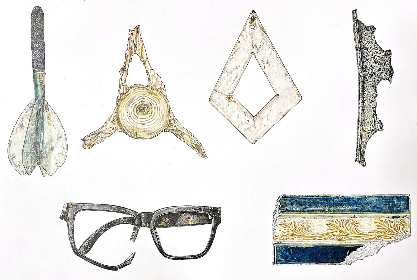 SALT LAKE CITY — Artist Mary Toscano’s work is contemplative and methodical. Her drawings betray the patient and meditative process underlying an artistic craft which requires constant repetition to master. Her exhibition In Solution, on view at Salt Lake City’s Alice Gallery, posits water-laden environments with eroded household items such as eyeglasses and gardening tools as allegories for the frailty of memory.