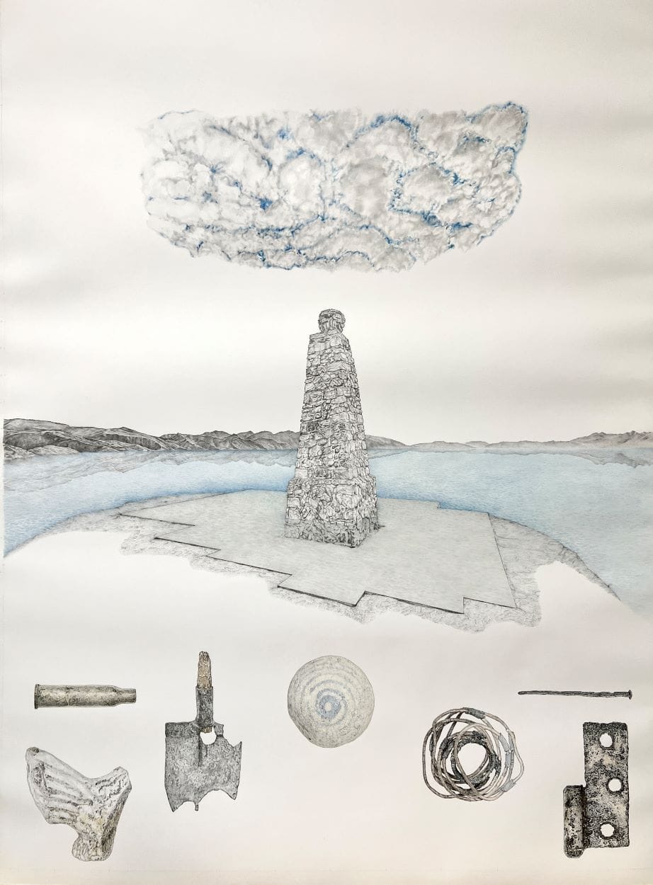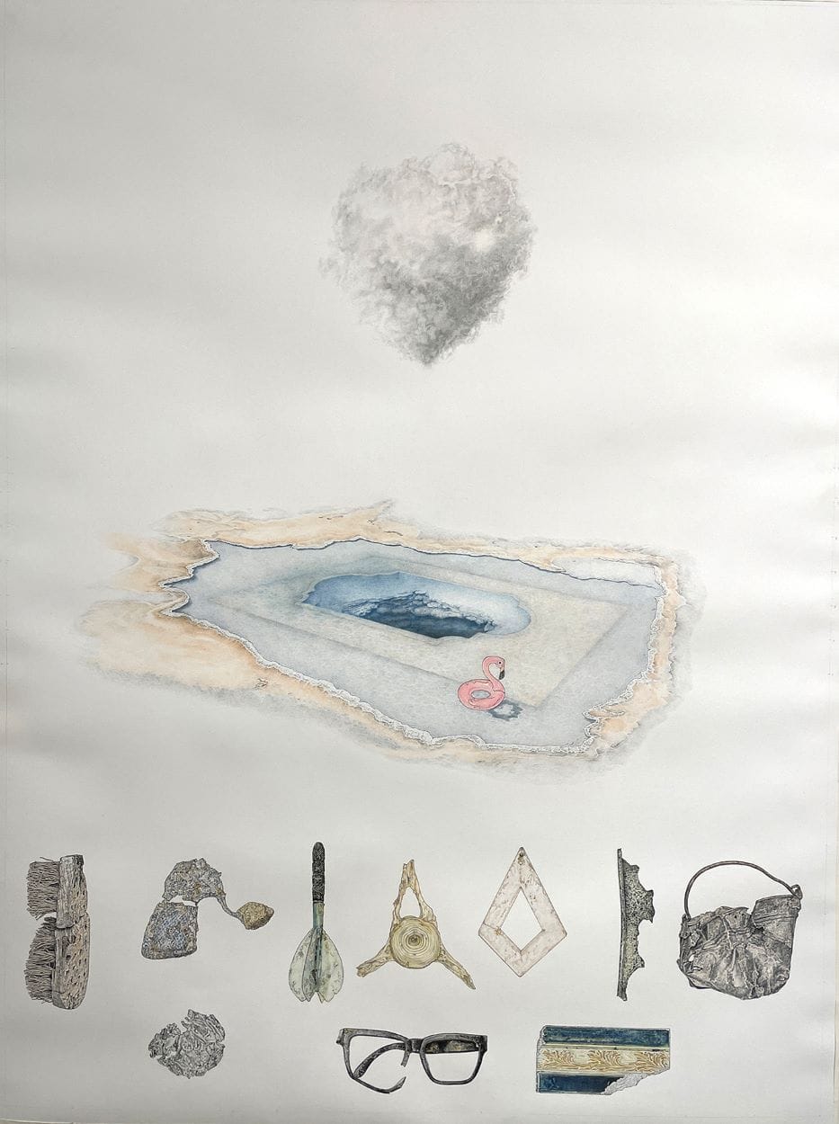 In Solution contains four new large-scale landscape drawings, all featuring bodies of water combined with intricate pencil illustrations of decaying or otherwise tarnished objects. Toscano, known for her amazingly detailed renderings of a variety of subjects, has in this body of work illustrated a sense of foreboding and loneliness, captured in the isolation of single objects within the cavernous landscape that surrounds them.