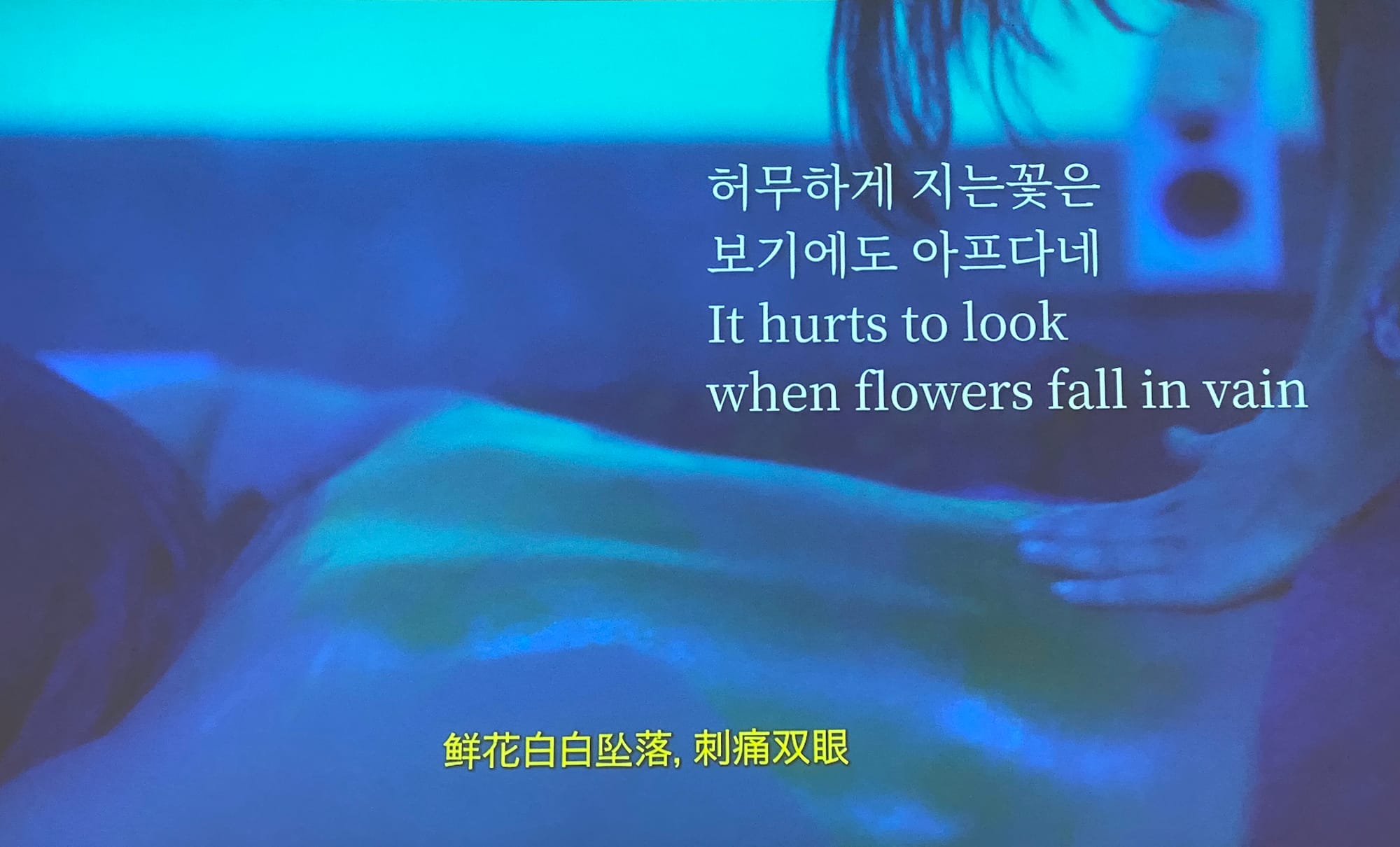 I pause for a moment in front of Fly in Power to see close-ups of a massage in motion, blue light bathing the scene of hands pressing against a bare back. Charlotte’s poetry appears in English, Korean, and Chinese script. “It hurts to look when flowers fall in vain,” she writes. “Now here we are carpeting your path, felling flowers behind you / May our touch warm the heart left stilled by deep frosts.”