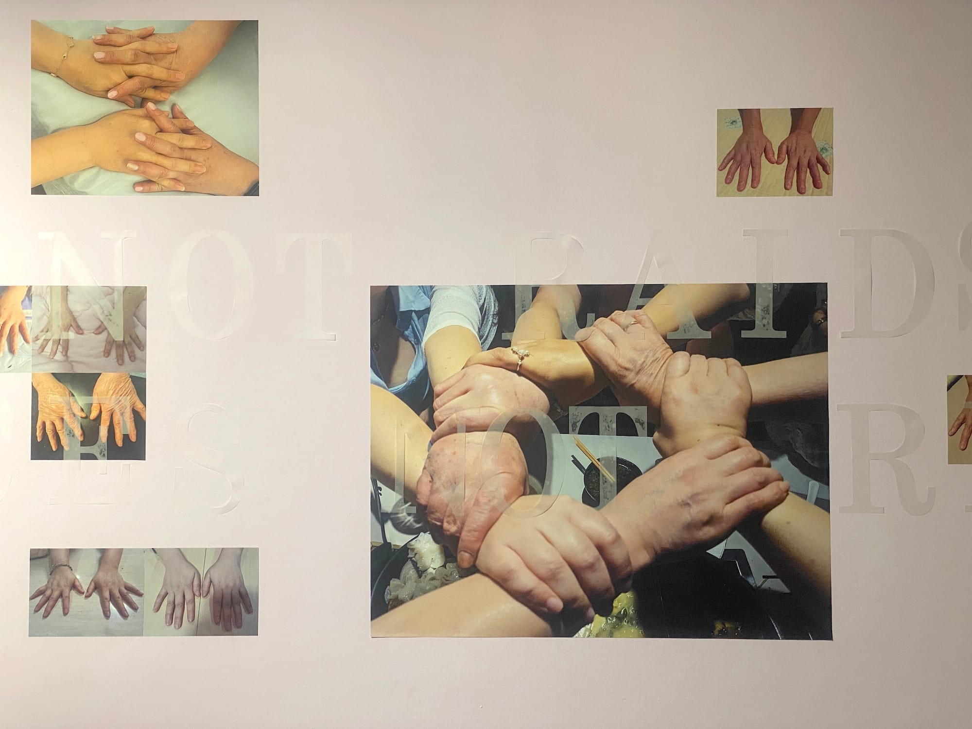 The other half of the installation features Fly in Power, a full-length documentary directed by Yin Q and Yoon Grace Ra that follows Charlotte, a Korean massage worker and core organizer at RCS. In one moving scene, Charlotte steps up on stage at a public gathering to commemorate those who died in Atlanta, and we see glimpses of the altars that she prepared for the event, with food, flowers, and people gathering. Alongside the documentary are photos by Red Canary Song members that show massage workers’ hands in various arrangements, sometimes interconnected, sometimes laid flat on a surface.