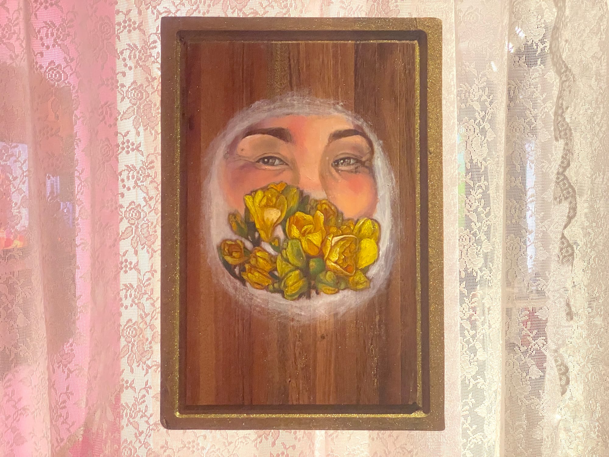 Portraits of these individuals appear in 8LIVES PORTRAITS, a series of paintings by Ellen, a Korean massage worker and member of Red Canary Song, a grassroots collective of Asian and migrant sex workers and massage workers. So as not to politicize their identities, the artist primarily depicted their eyes and covered their mouths with flowers used in both spas and altars. Rather than canvas, they used chopping boards, a reference to massager workers’ resourcefulness with everyday objects in their daily lives.