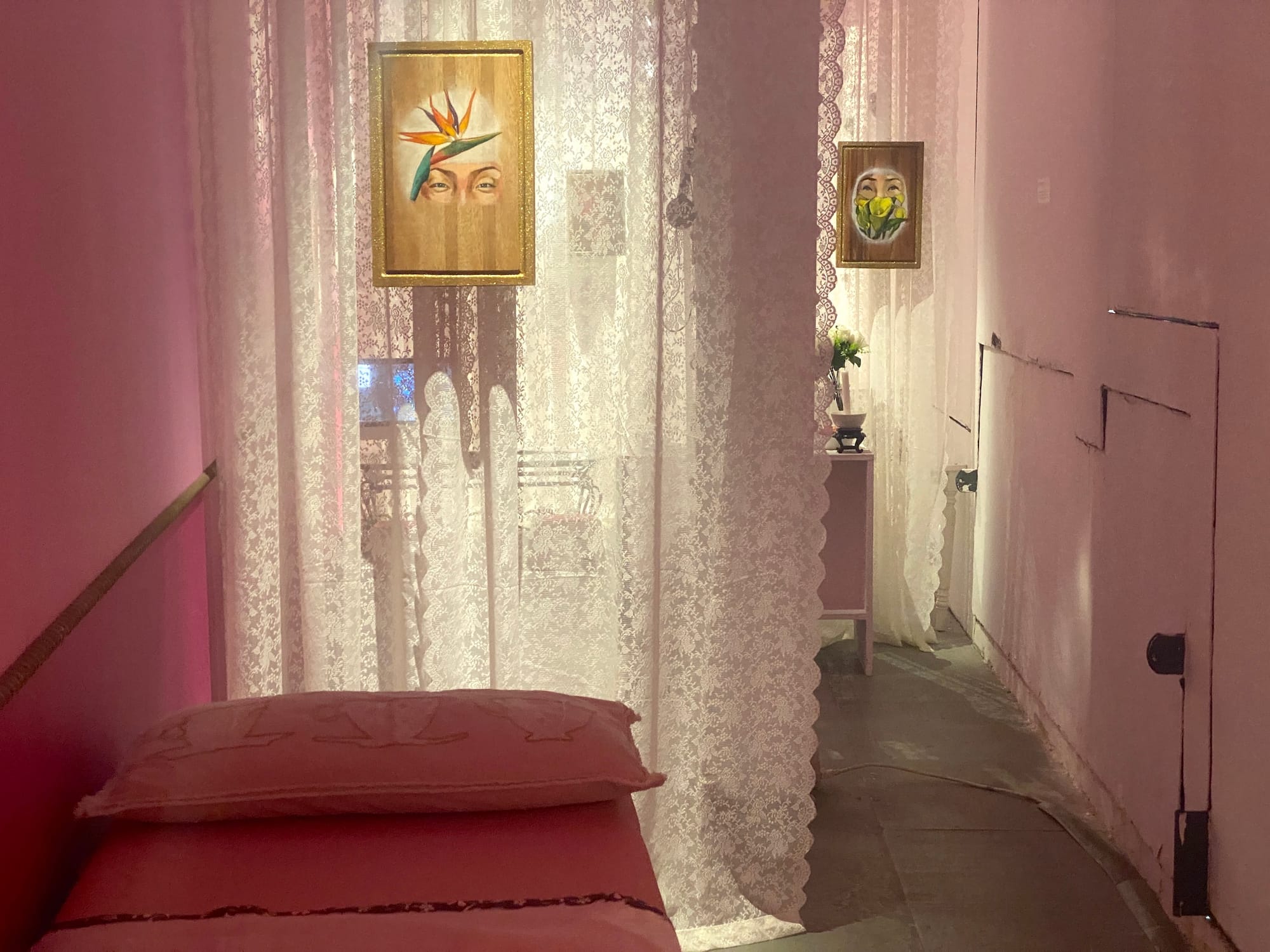 These works are part of Flower Spa: Solidarity Outside In, on view through this Saturday at the Storefront for Art and Architecture and featuring work by RCS. Half the installation is designed to evoke a massage parlor, with a bed and curtains and even a security door made with clear tape and curtain blinds by artist Chong Gu. A portion of a New York City Department of Building Summons Order appears on the gate with a charge of illegal occupation without a license.