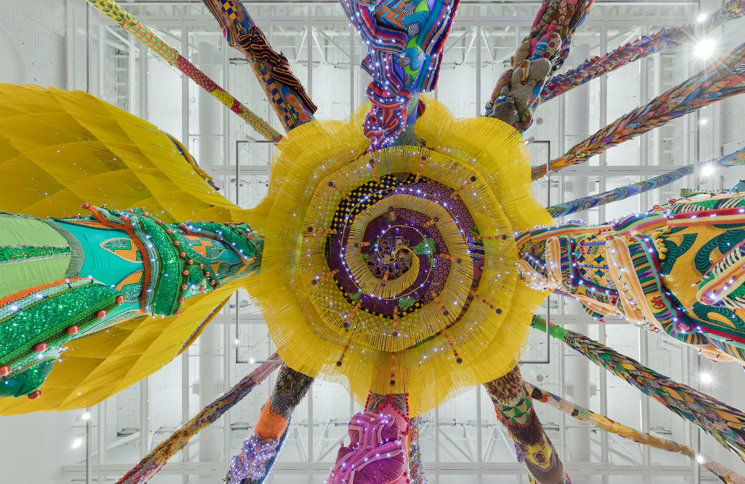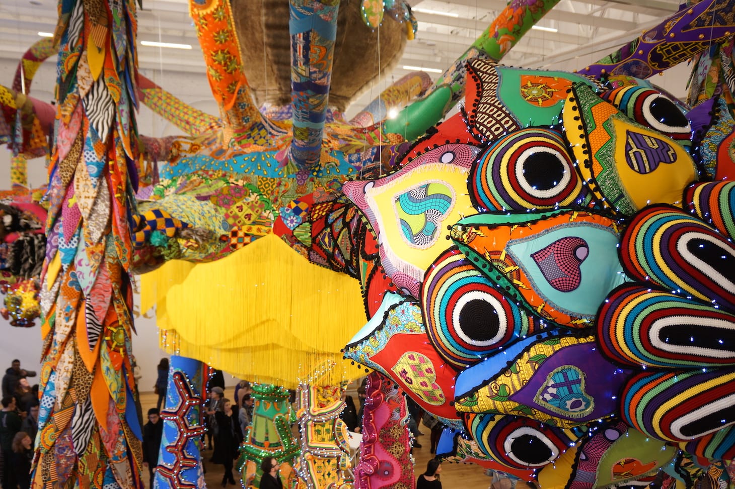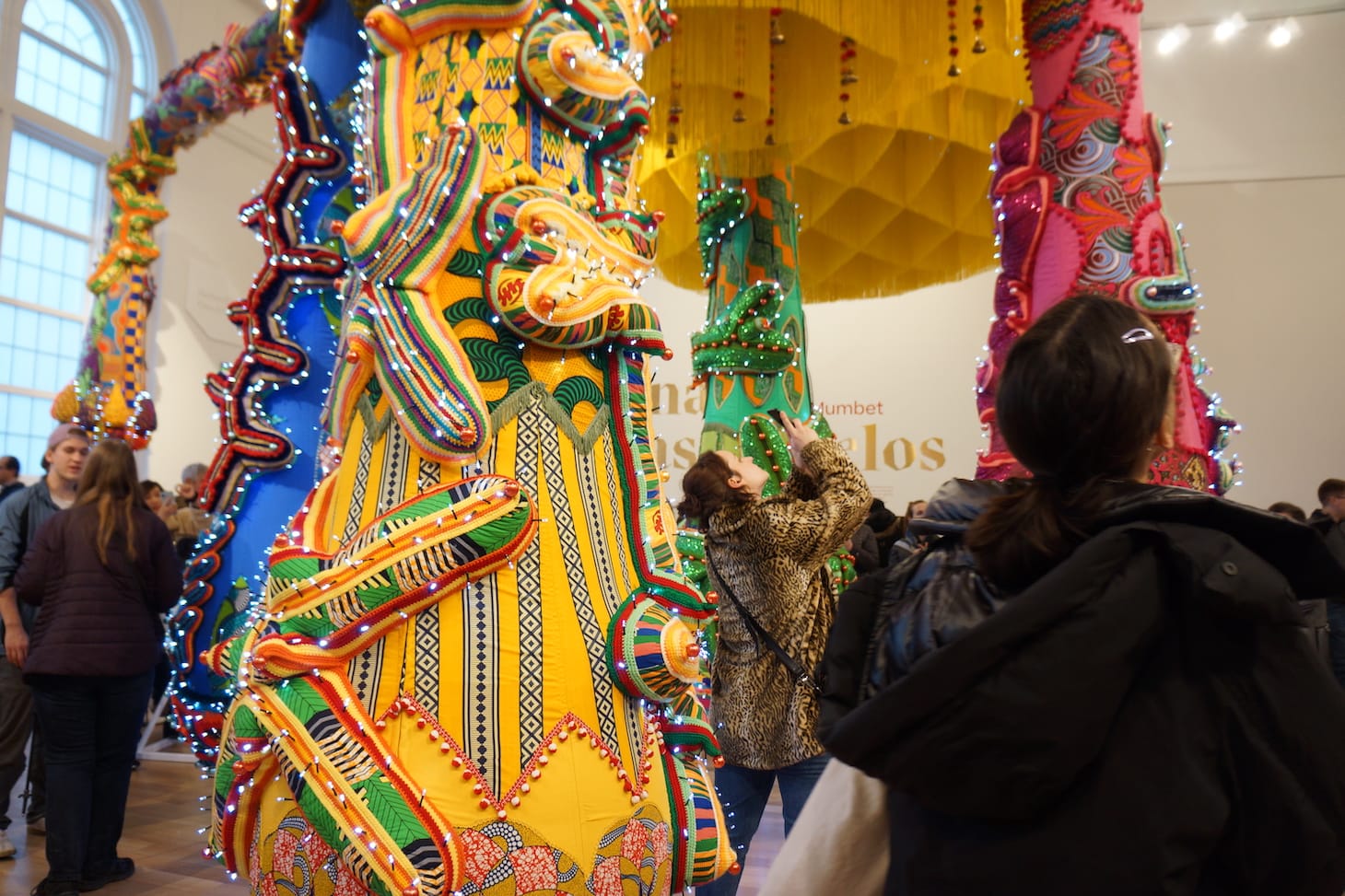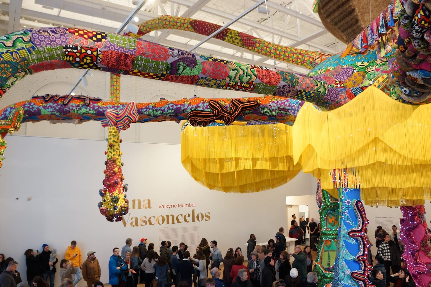Guttormsen continued by admiring the star of the opening: Portuguese artist Joana Vasconcelos’s monumental, site-specific, installation “Valkyrie Mumbet” (2020). The 37-foot inflatable and crocheted octopus-like creature is indeed impressive. It’s bright, nuanced, and understandably inspiring to the MassArt community that will live with and work around it until August 2020. An homage to once-enslaved Elizabeth “Mumbet” Freeman, who won her own freedom in court in 1781 and helped to make slavery illegal in Massachusetts, “Valkyrie Mumbet” fills the whole second level of the 15,000-square-foot museum.