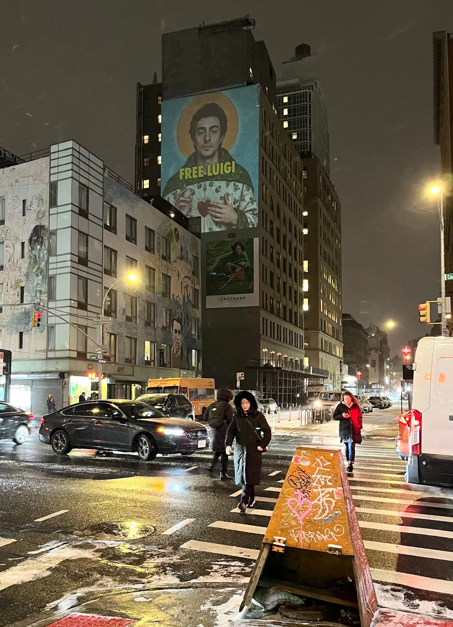 Emblazoned in the center of the enormous projection at the intersection of Canal and Lafayette Streets, the words "Free Luigi" have been chanted, inscribed, grafittied, meme'd, and commercialized worldwide. Prior to Mangione's arrest in Altoona, Pennsylvania, UnitedHealthcare CEO Brian Thompson's shooting ignited fervent conversations about exorbitant medical care costs, the exasperation and desperation around denied claims, and the ethics of health insurance companies determining what constitutes necessary patient care.