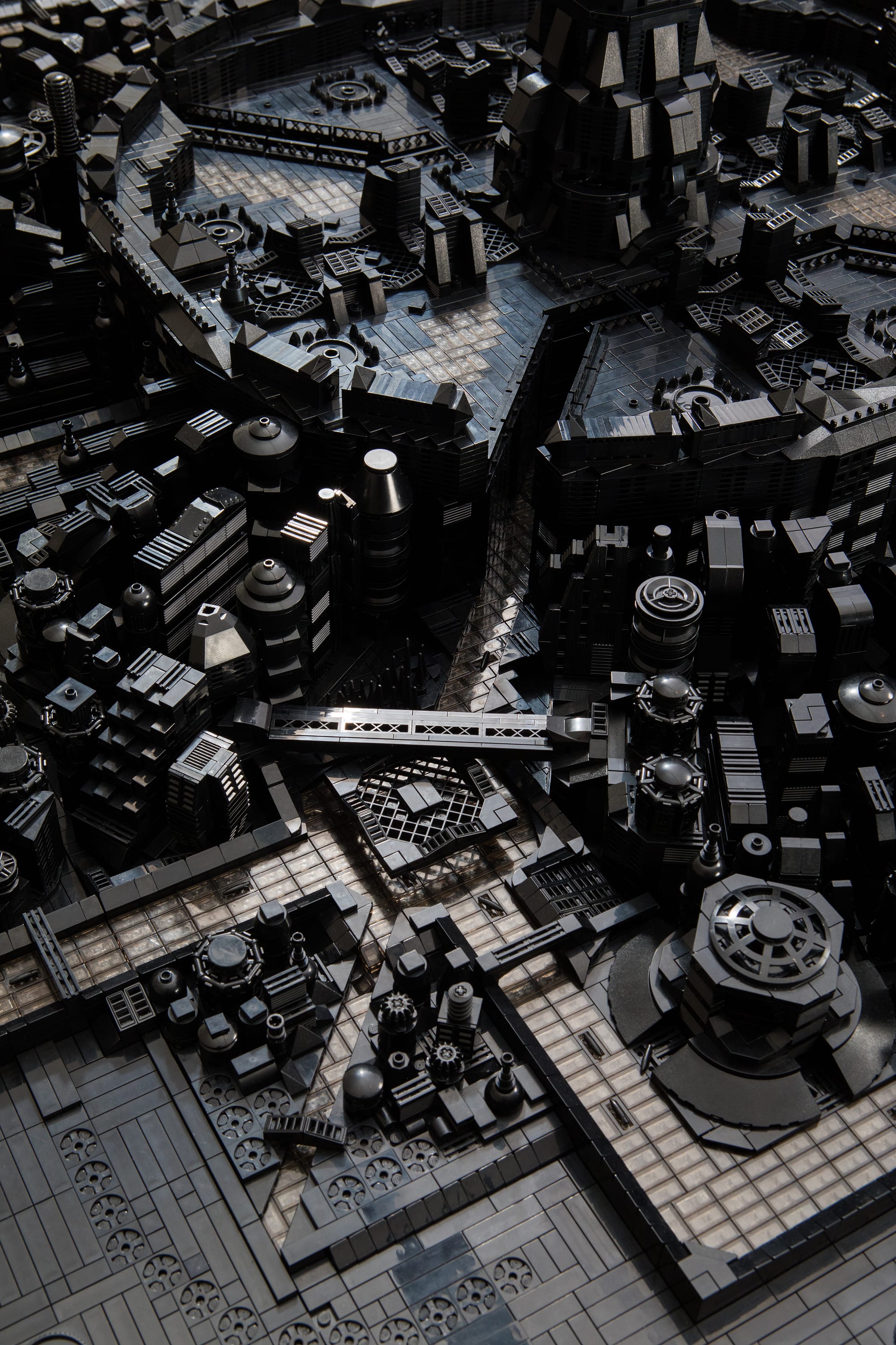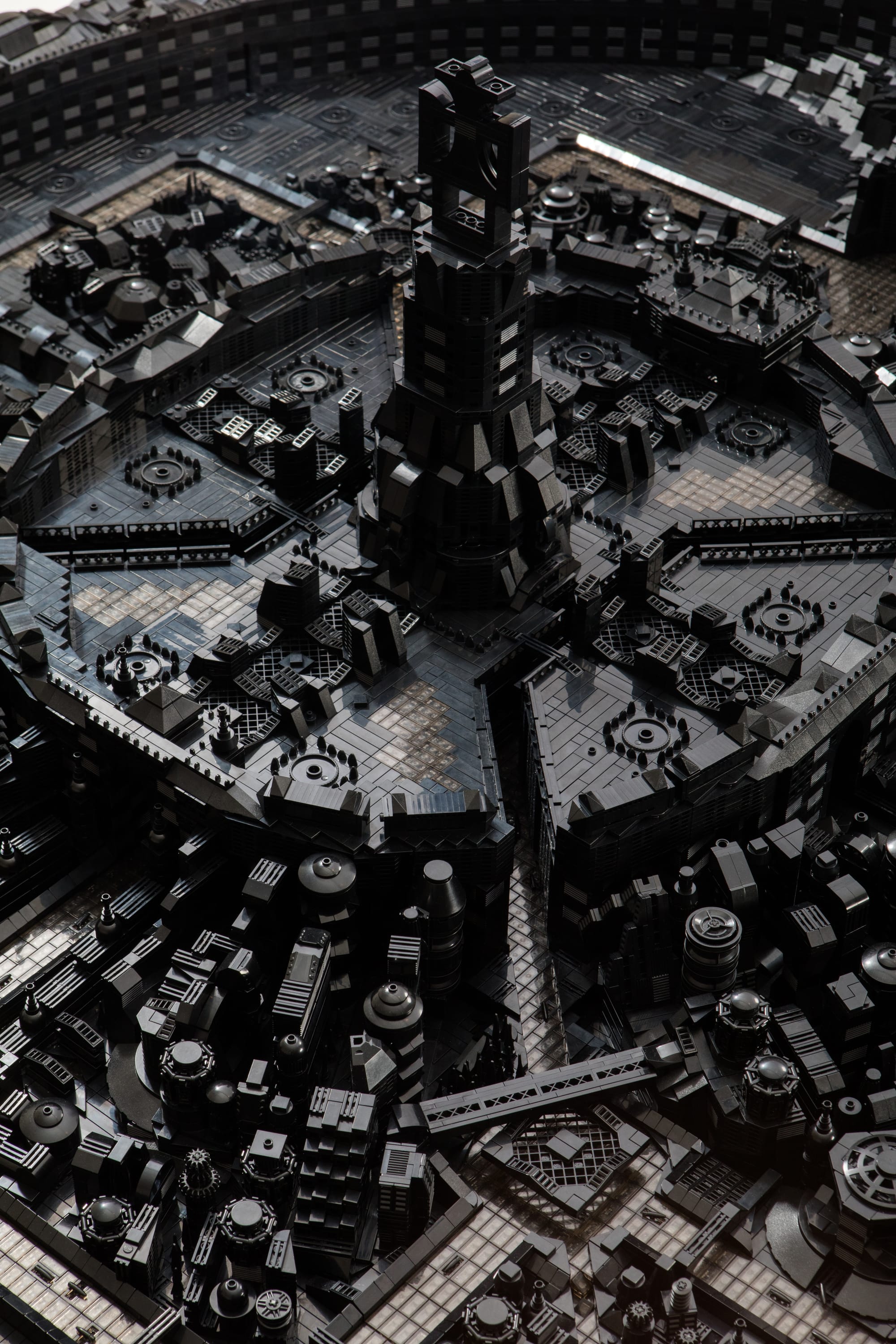 In Building Black: Civilizations, part of an ongoing series of Lego-made sculptures, Nimako imagines the legacies of past sub-Saharan civilizations into the distant future. The centerpiece of the project, "Kumbi Saleh 3020 CE" (2019), takes its name from the capital city of the ancient Ghana Empire. Constructed with 100,000 black Lego pieces, the 30-square-foot sculpture renders the lost trade capital into a futuristic, bustling metropolis with detailed references to the Islamic influences that shaped its architecture and history.