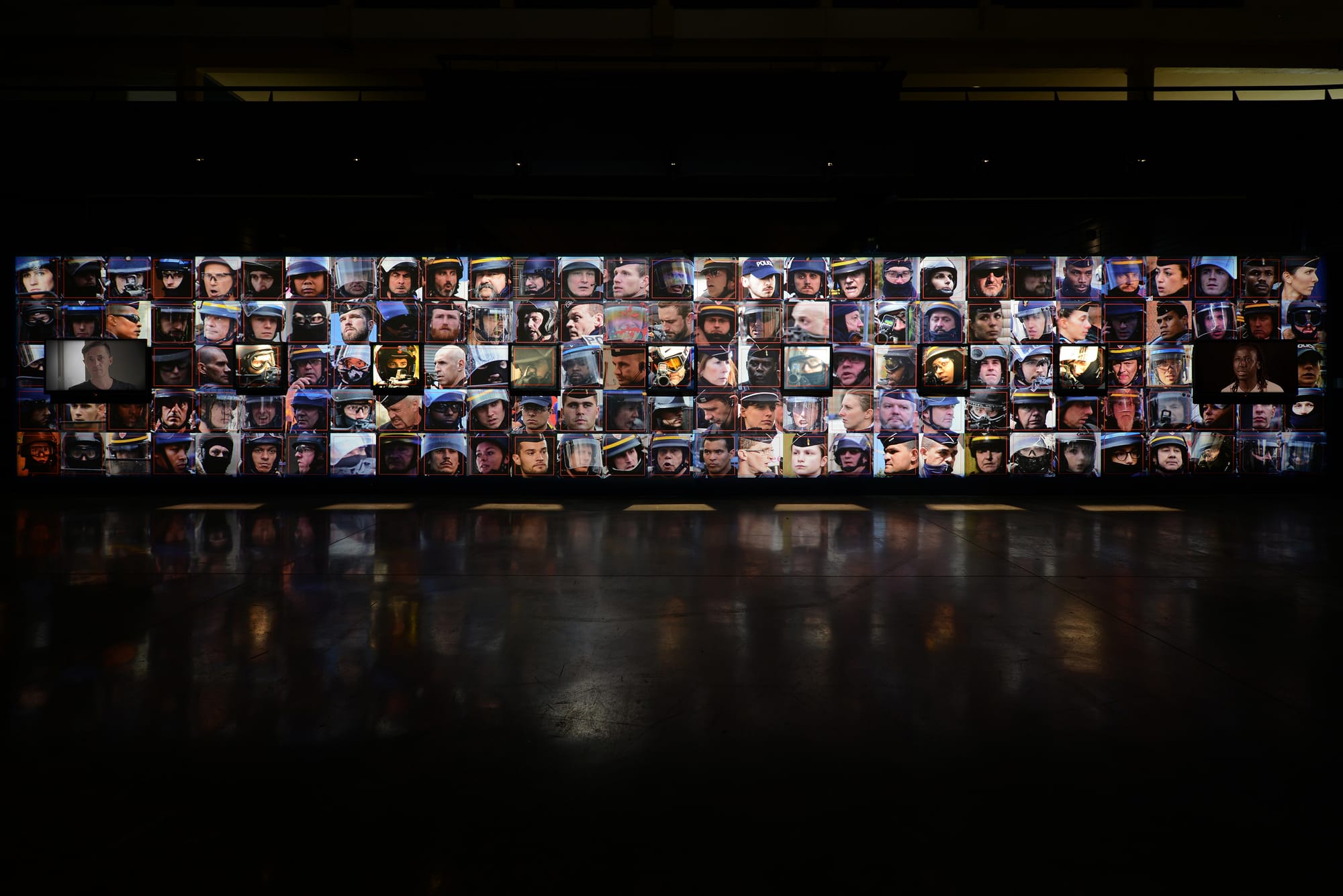 Detail of Artist Paolo Cirio's installation Capture, featuring headshots of French police officers (courtesy the artist)