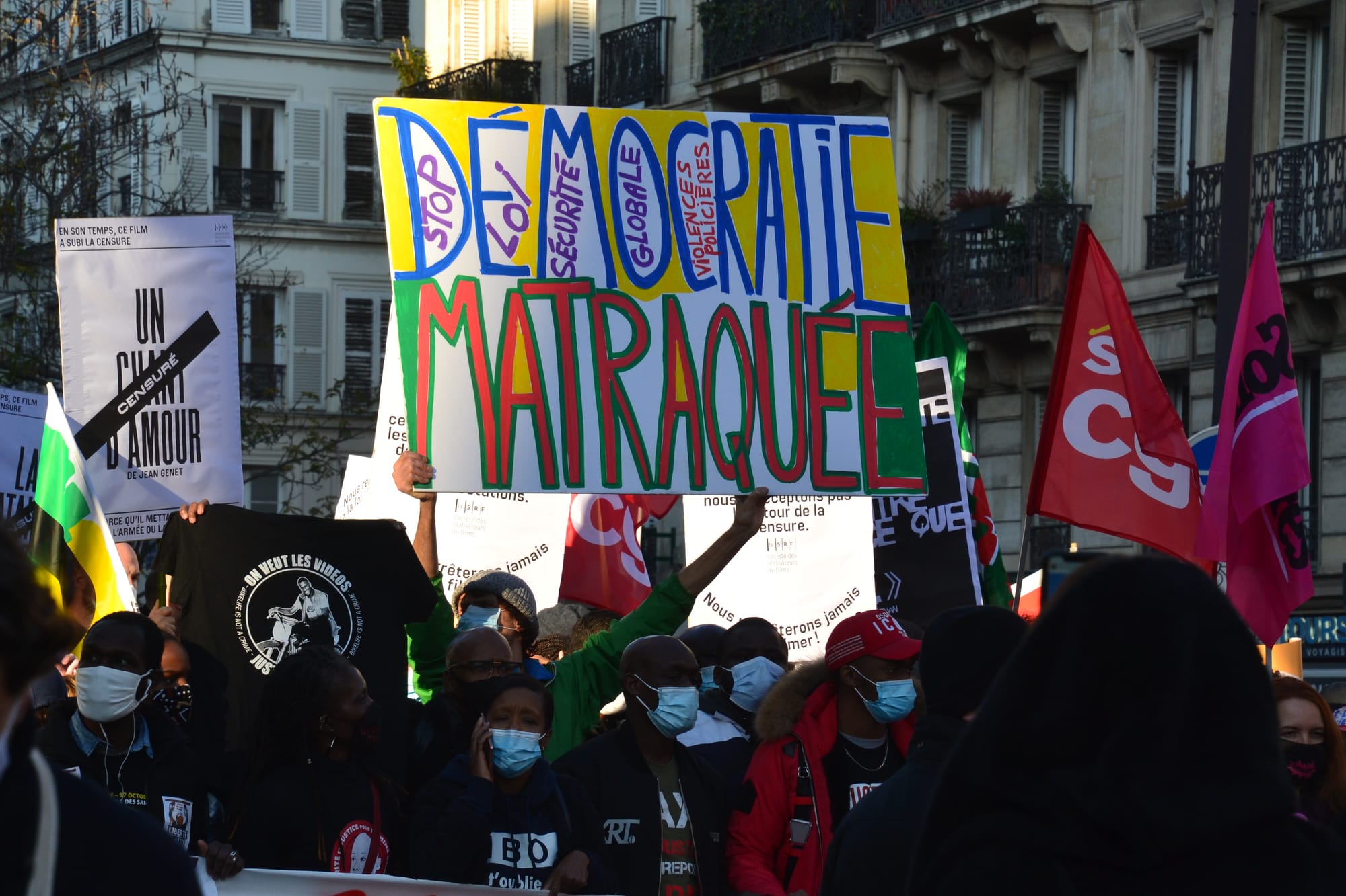 Protesters in Paris carrying a sign that reads "Bludgeoned Democracy" on November 28, 2020 (Jeanne Menjoulet/Flickr)