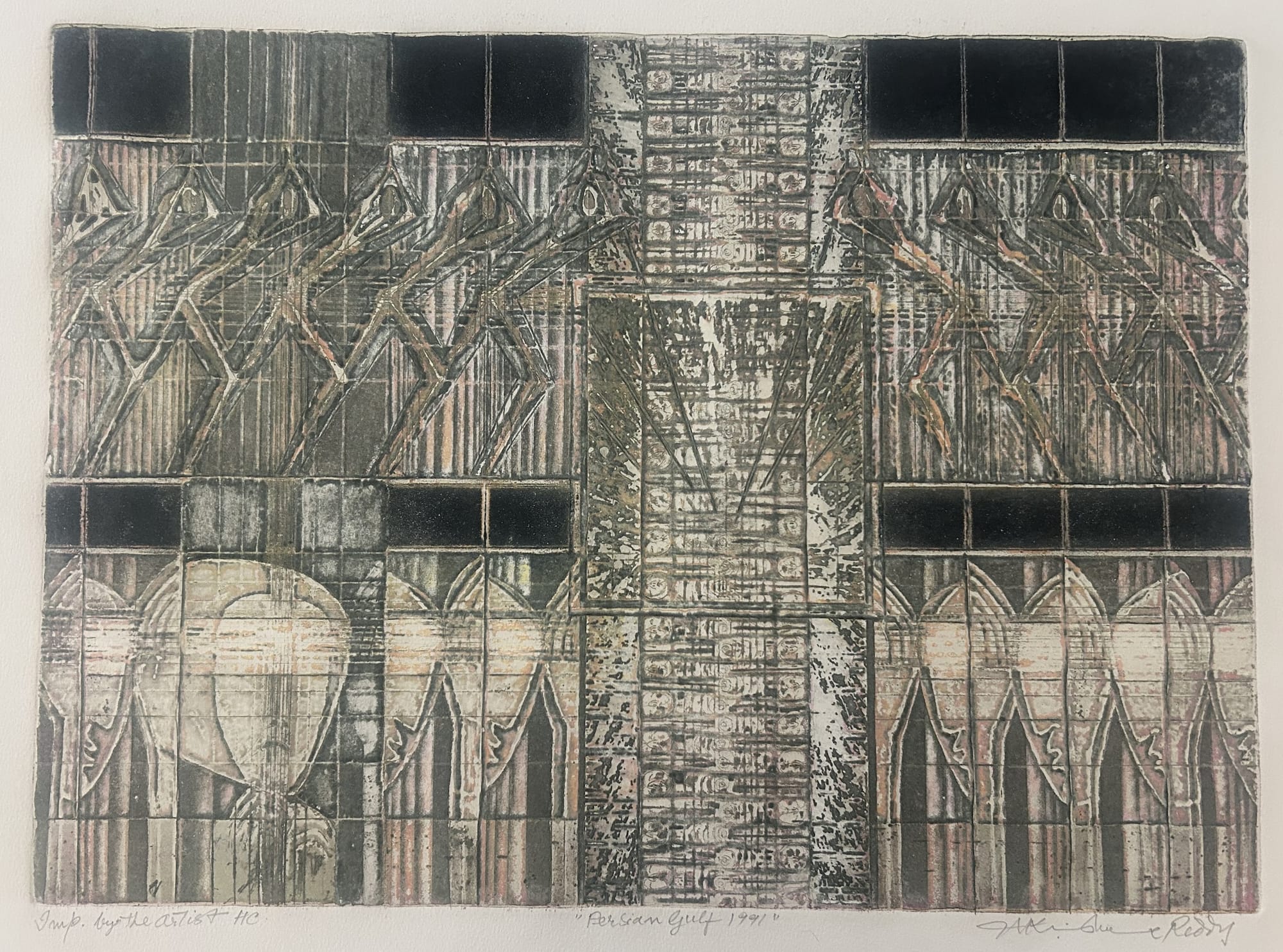 Artist Joyce Wellman was interested in color, as well, and attended Reddy’s workshops alongside Williams. The two often worked side by side in the open space of the print workshop and helped each other with the physical and arduous process of printing. Wellman told me that Reddy taught her persistence and encouraged her to think deeply about the plate and the materials. His teachings went beyond the technical steps of printmaking, extending into the philosophical aspects of creating a work of art.