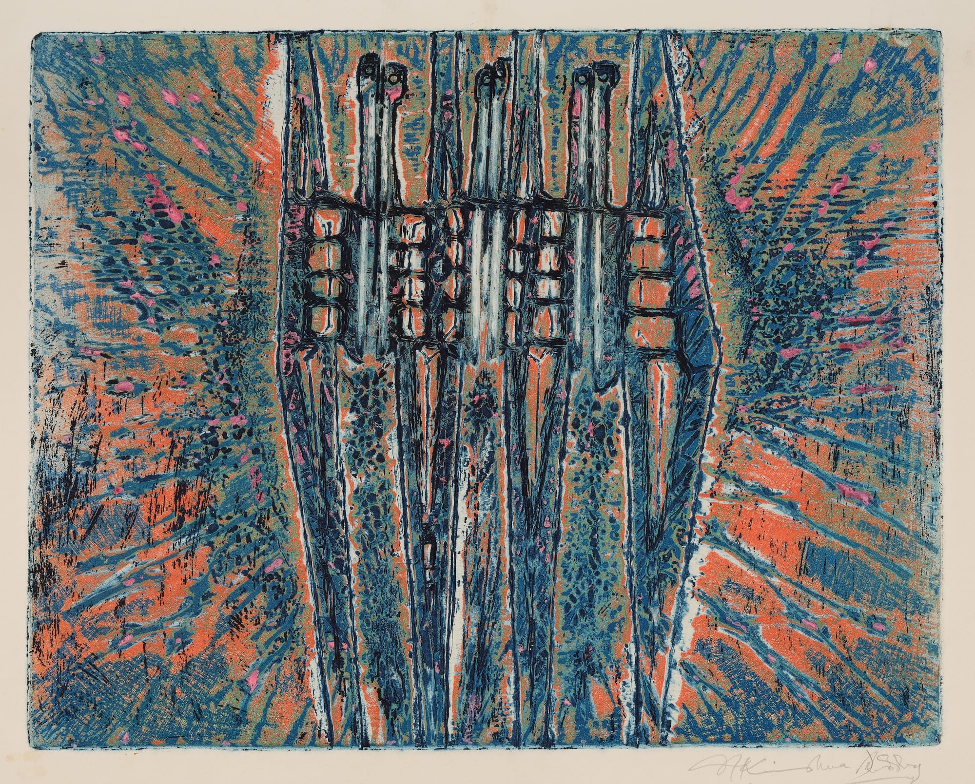 When Reddy joined Hayter’s Atelier 17 in 1951, it was already known as a place for artists such as Max Ernst, Alberto Giacometti, and Joan Miro to experiment and collaborate. In the vast, open-layout space of the print studio, ideas flowed freely. Hayter was not interested in the commercial aspects of printing and encouraged artists to learn from each other and collaborate with master printers at the Atelier.