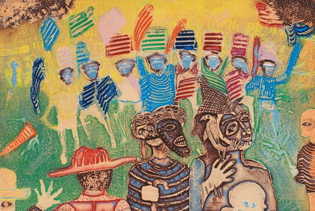Artist and sculptor Michael Kelly Williams, who first encountered Reddy while taking his classes at Blackburn’s in the late 1970s, told me that he credits Reddy with fostering a sense of collaboration and experimentation in his own printmaking. For the print “West Indian Day Parade” (1983), Williams worked with fellow artist Helio Salcedo to draw out the images on an abandoned plate using engraving, metal stamps, and textural effects. They experimented with the color scheme — with Salcedo applying the colors à la poupée and Williams using the viscosity technique — to create a lively and celebratory scene.